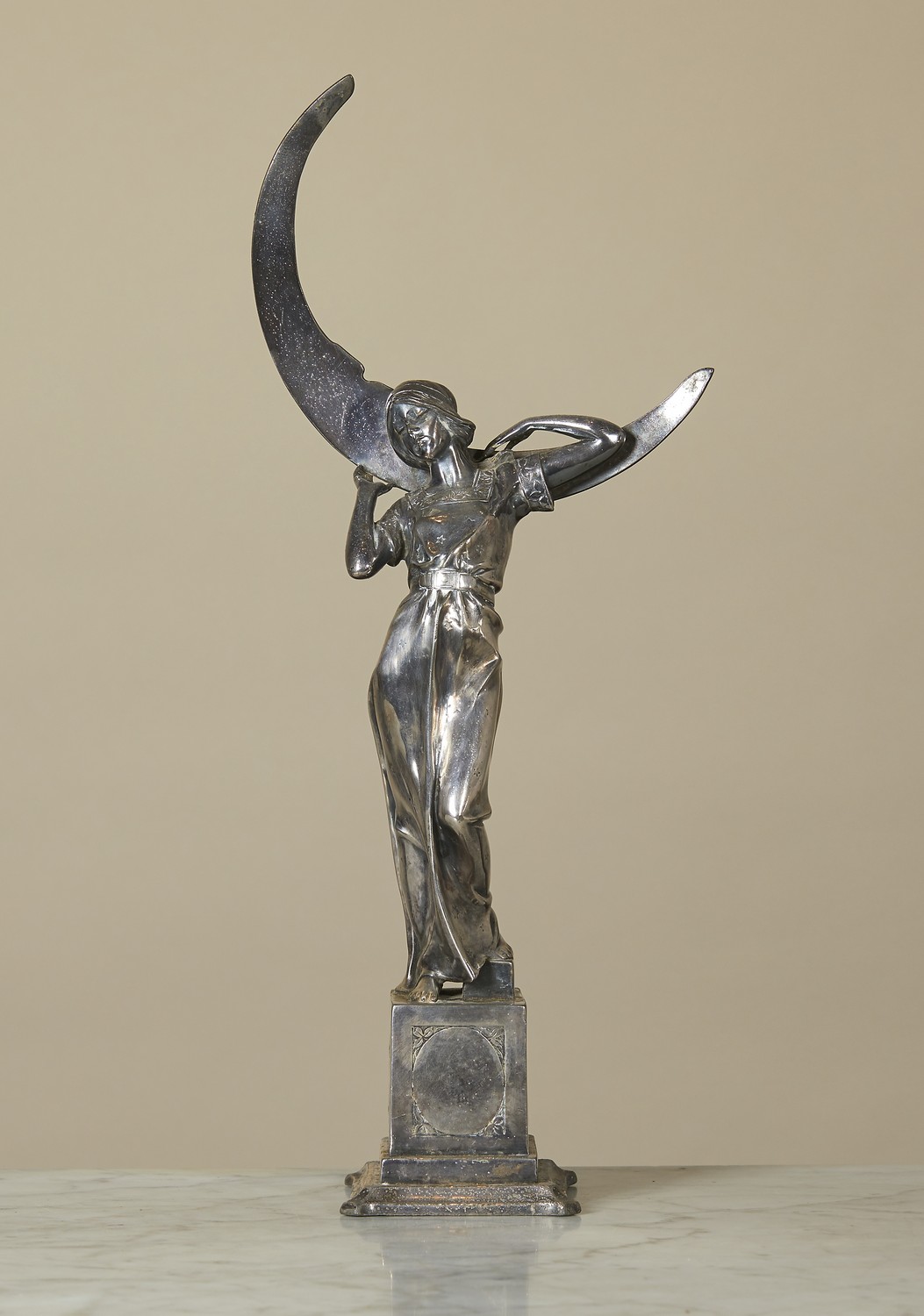 The young woman clothed in a star decorated robe and carrying a crescent moon on her shoulders, on a square plinth with relief panels of Venus with Cupid, moulded foot.