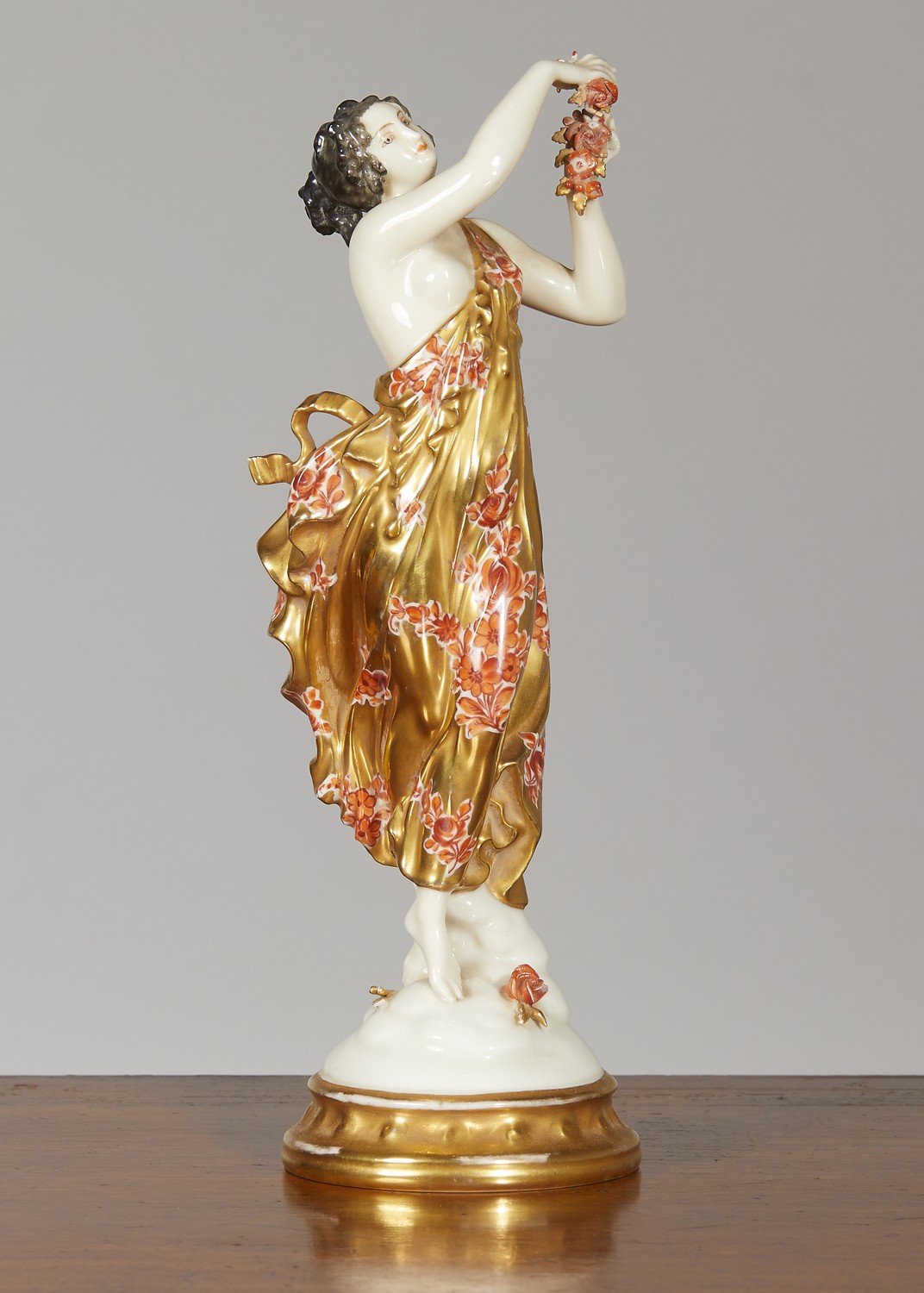 Underglaze blue crowned N mark, the classically draped woman in a gold lustre robe with red flowes, on a circular base.