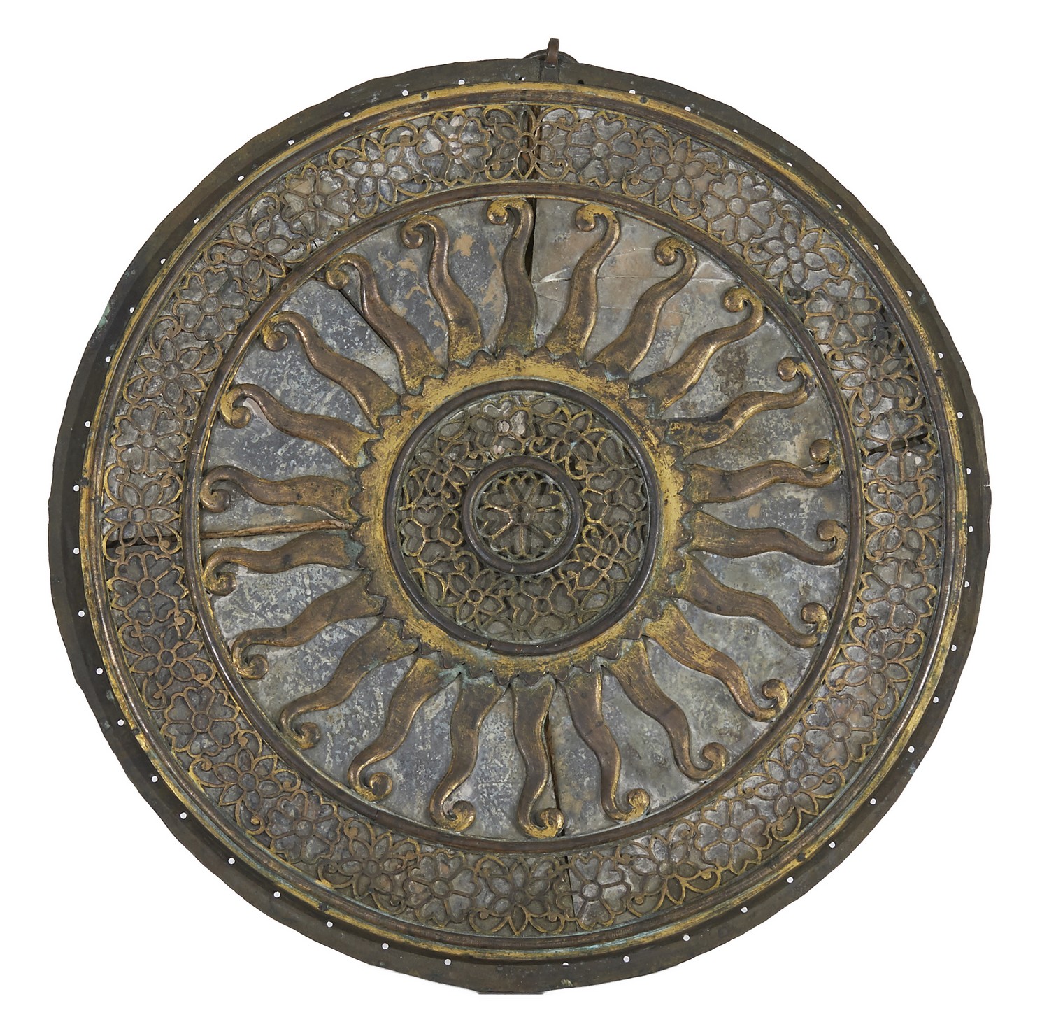 Circular with a pierced foliate and sunburst design over the mottled glass.