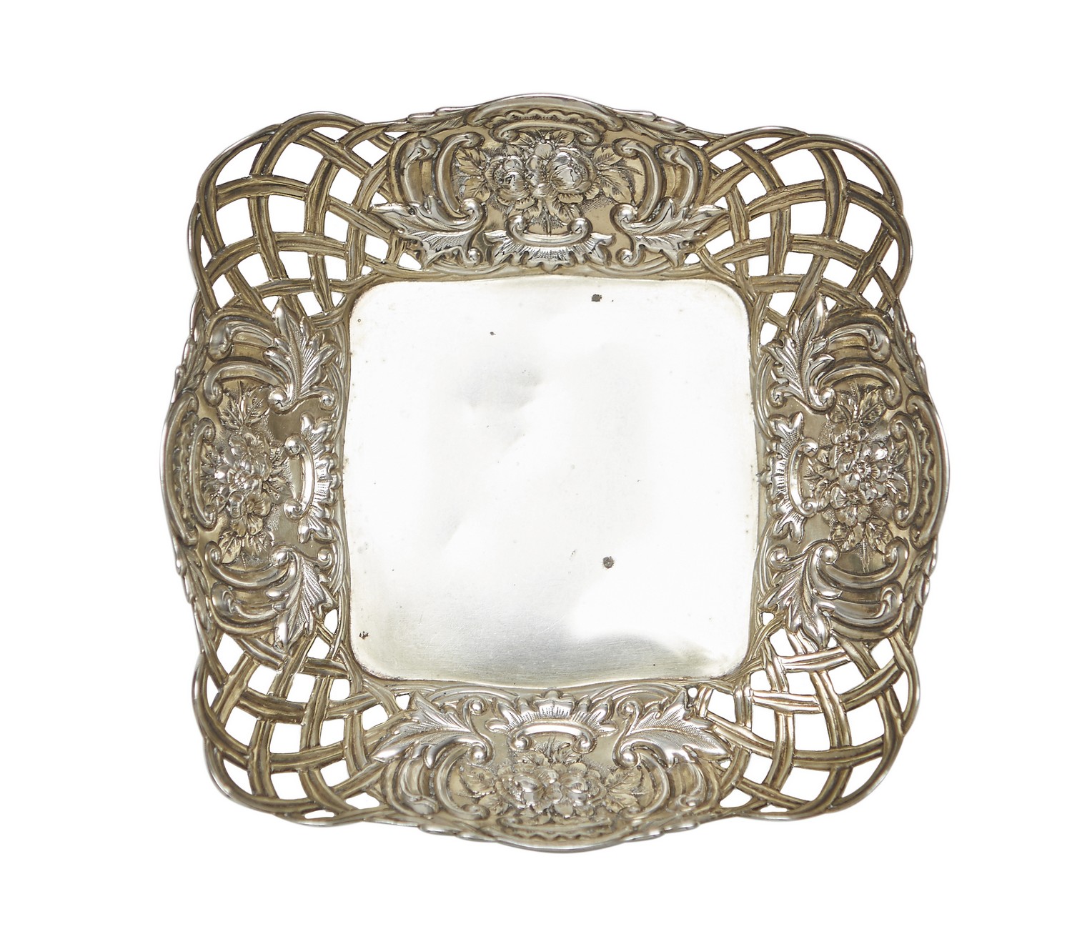 Make's mark of Gorham & Co, date letter indistinct, possibly 1922, shaped square, with repoussé panels of rocaille and flowers and open latticework corners.
