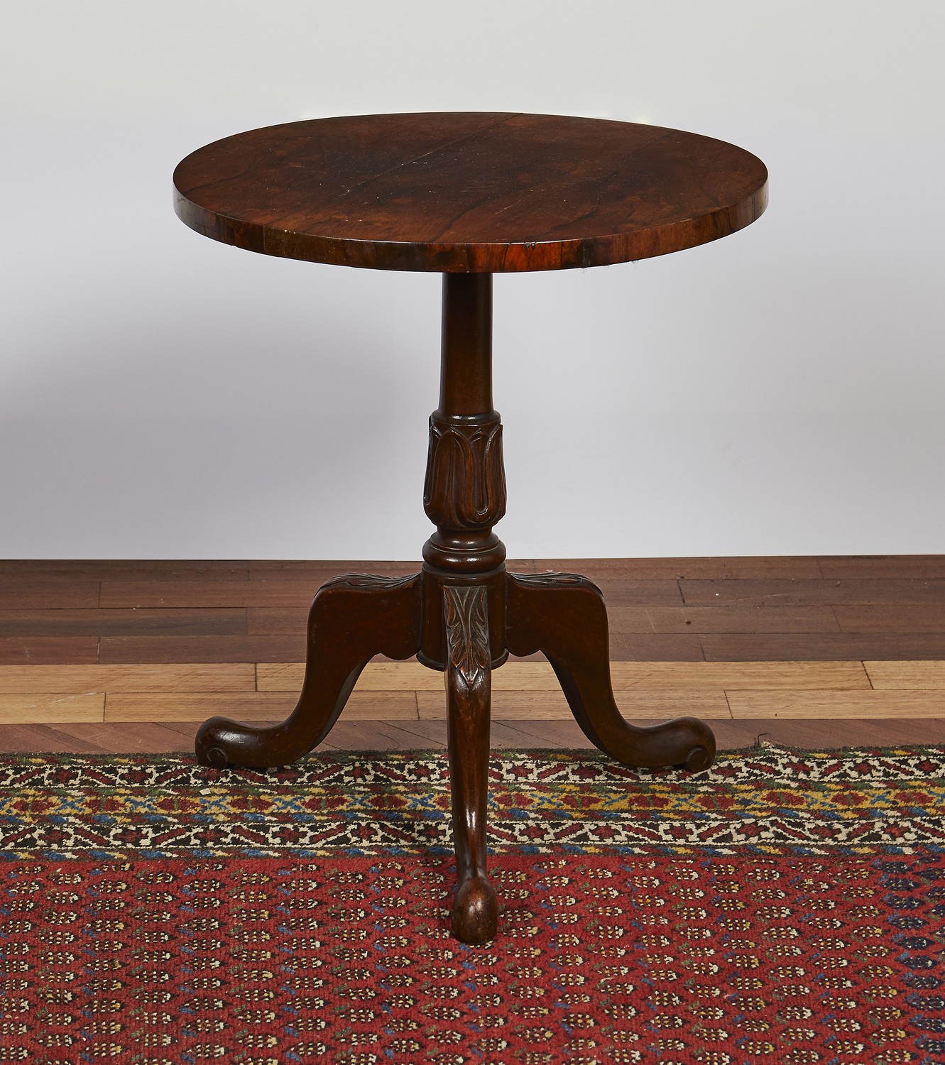 The circular rosewood top on leaf carved pedestal and three swept feet.