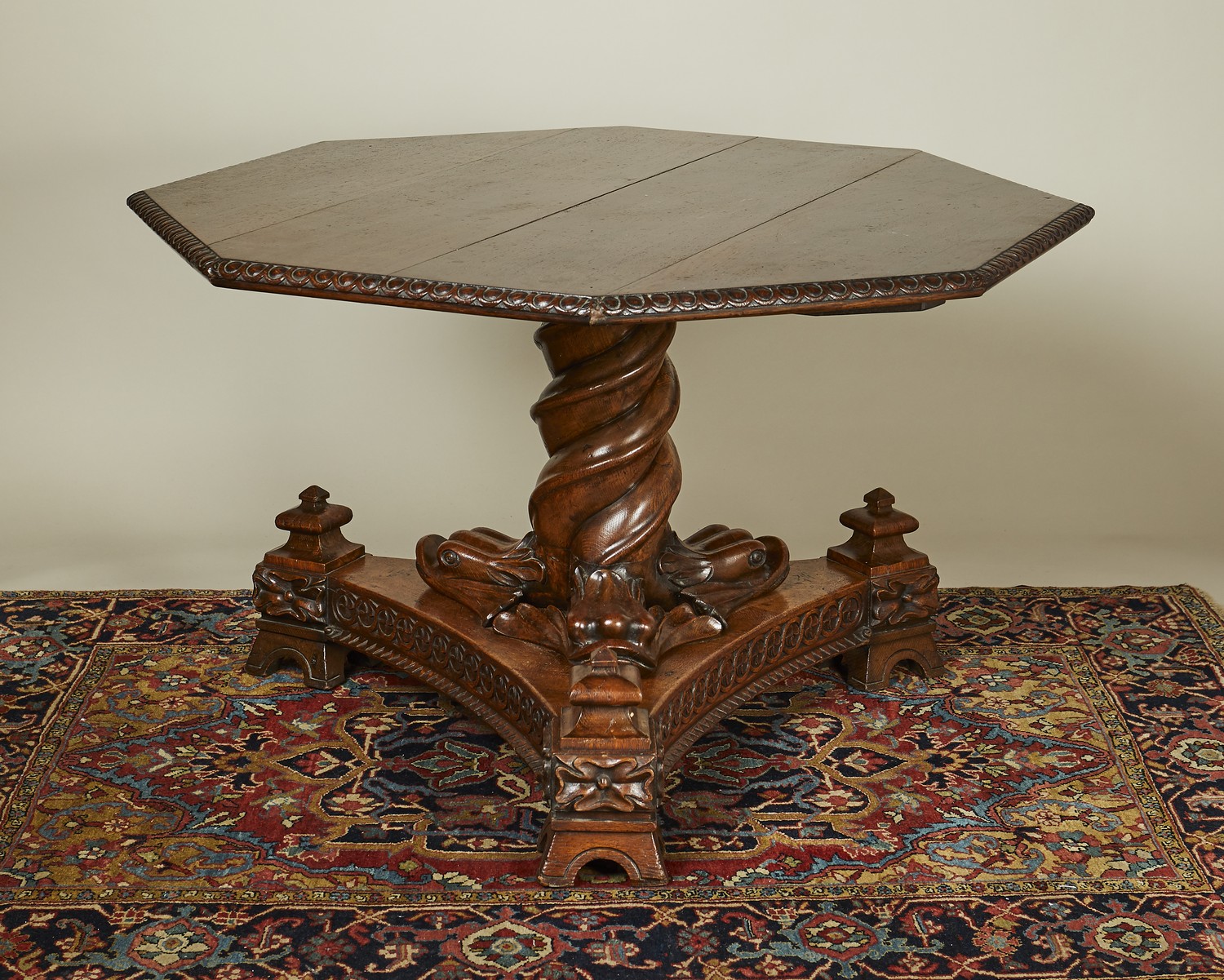 The octagonal tit top with egg and dart carved edge on a pedestal of three addorsed dolphins and a tricorn base with carved entrelac and dog tooth ornament.