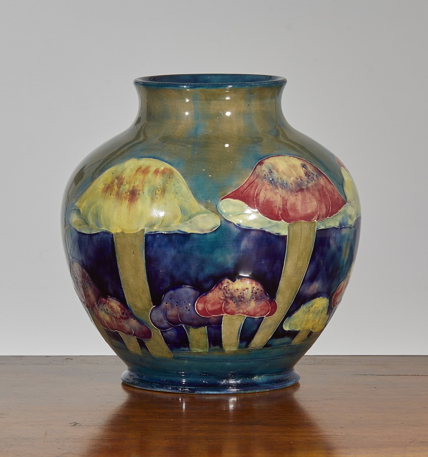 Of squat baluster form painted with a design of toadstools in shades of claret, blue and olive, painted facsimile signature, impressed "Moorcroft Burslem England".
