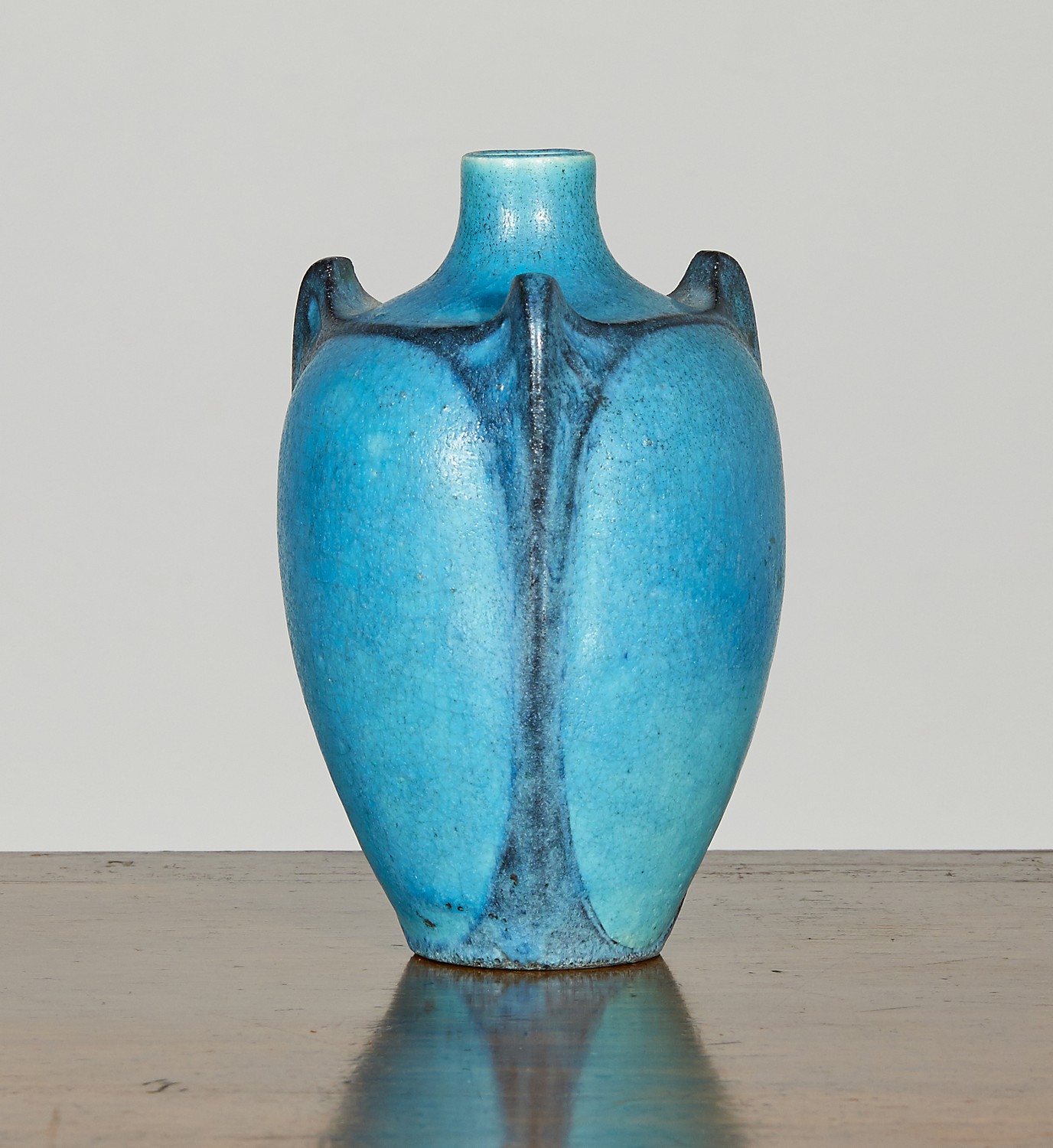 With three horned shoulders, in matte blue faience, signed LACHENAL to base.