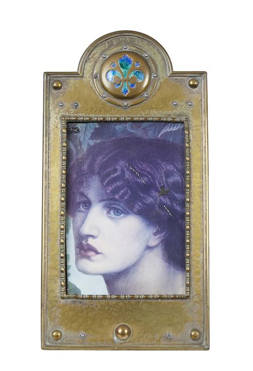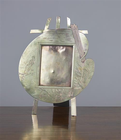 A Liberty style hammered brass frame having applied roundel with enamel fleur de lys, traces of silver plate; and a strut frame in the form of an easel, artist's palette and brushes engraved with a ploughman (2).