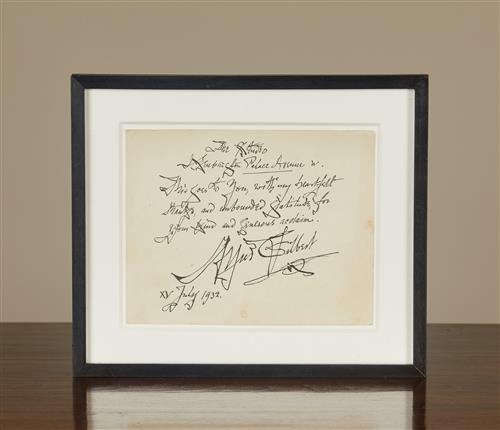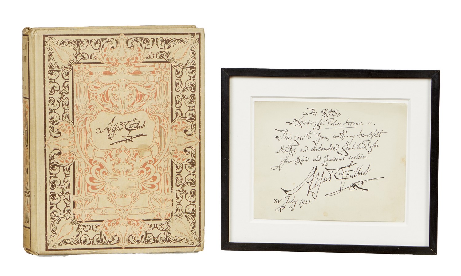 Together with a framed card "The Studio Kensington Palace Avenue W. This goes to you, with heartfelt thanks, and and unbounded gratitude, for your kind and generous acclaim, Alfred Gilbert, XV July 1932" (2).