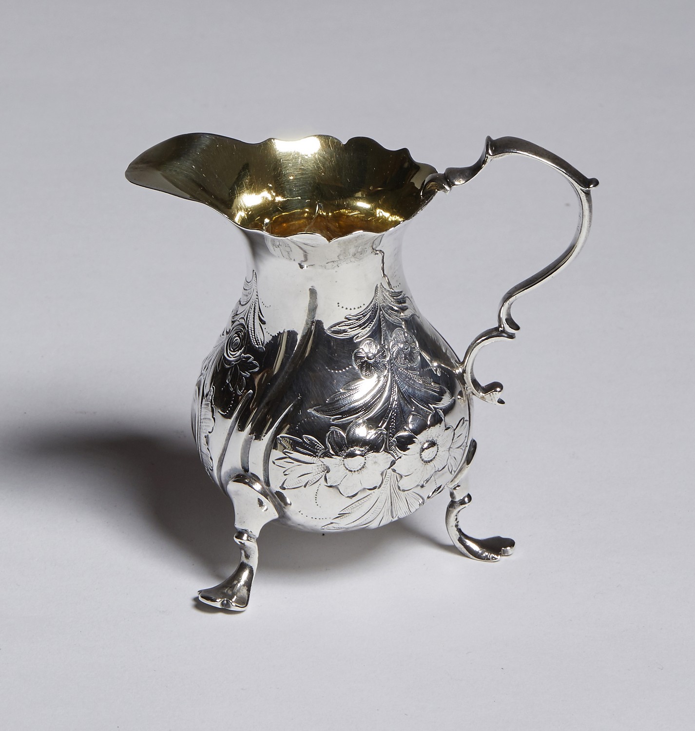 Maker's mark indistinct, London 1750, of baluster form, the body with repoussé flowers sprays and a rocaille cartouche engaged with a crest, on three pad feet.