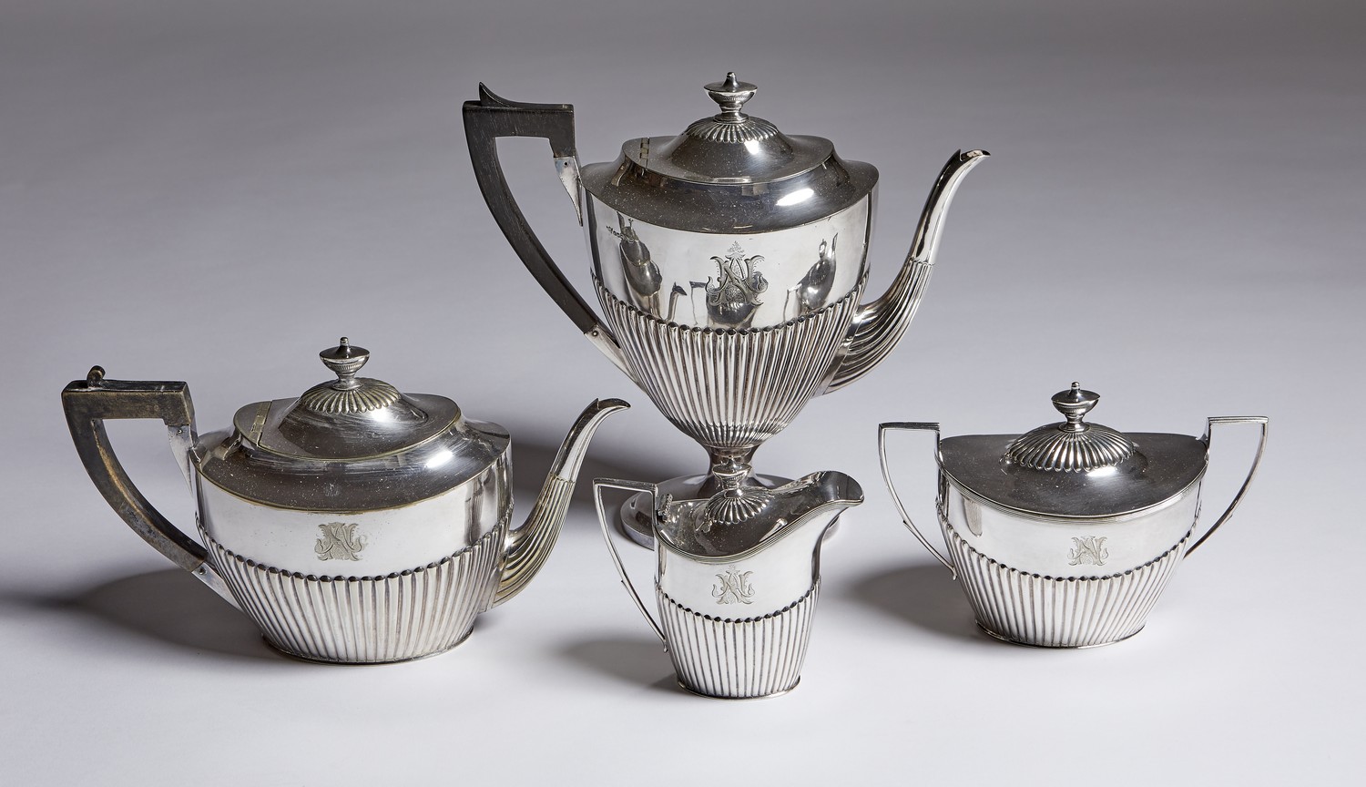 Maker's mark of Spurrier & Co, late 19th century, of half reeded design comprising coffee pot, tea pot, covered sugar basin and cream jug, all engraved with the initials NA.