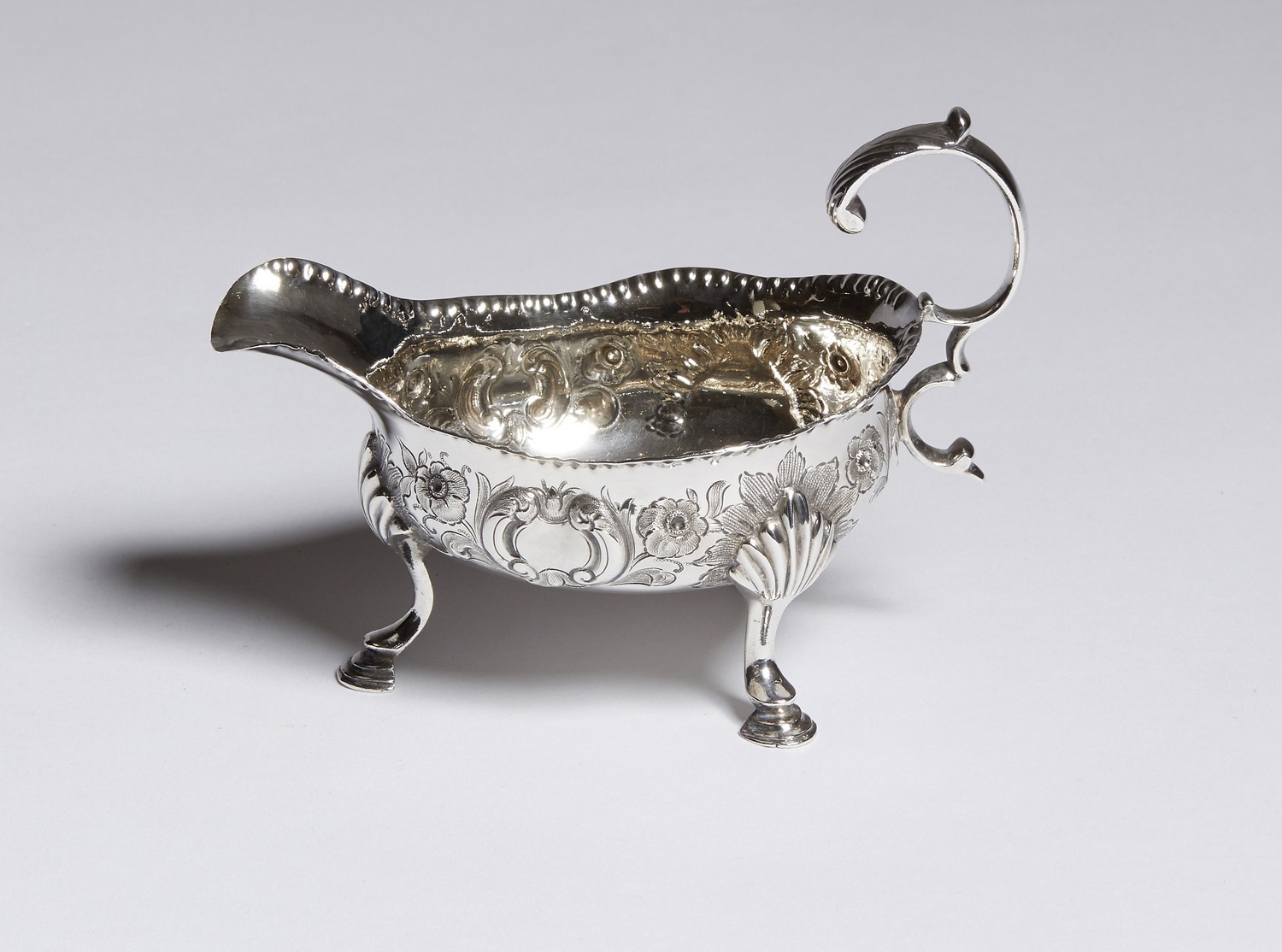 Maker's mark indistinct, London 1771, with scroll handle the body with repoussé flowers and rocaille, on three hoof feet.