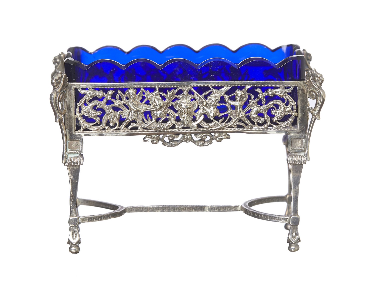 Apparently unmarked, in the form a miniature jardiniere stand, with a scalloped blue glass liner, the sides with pierced panels centred with satyr mask and putti and gryphons amidst scrolls on tapering legs joined by greek key engraved stretchers.