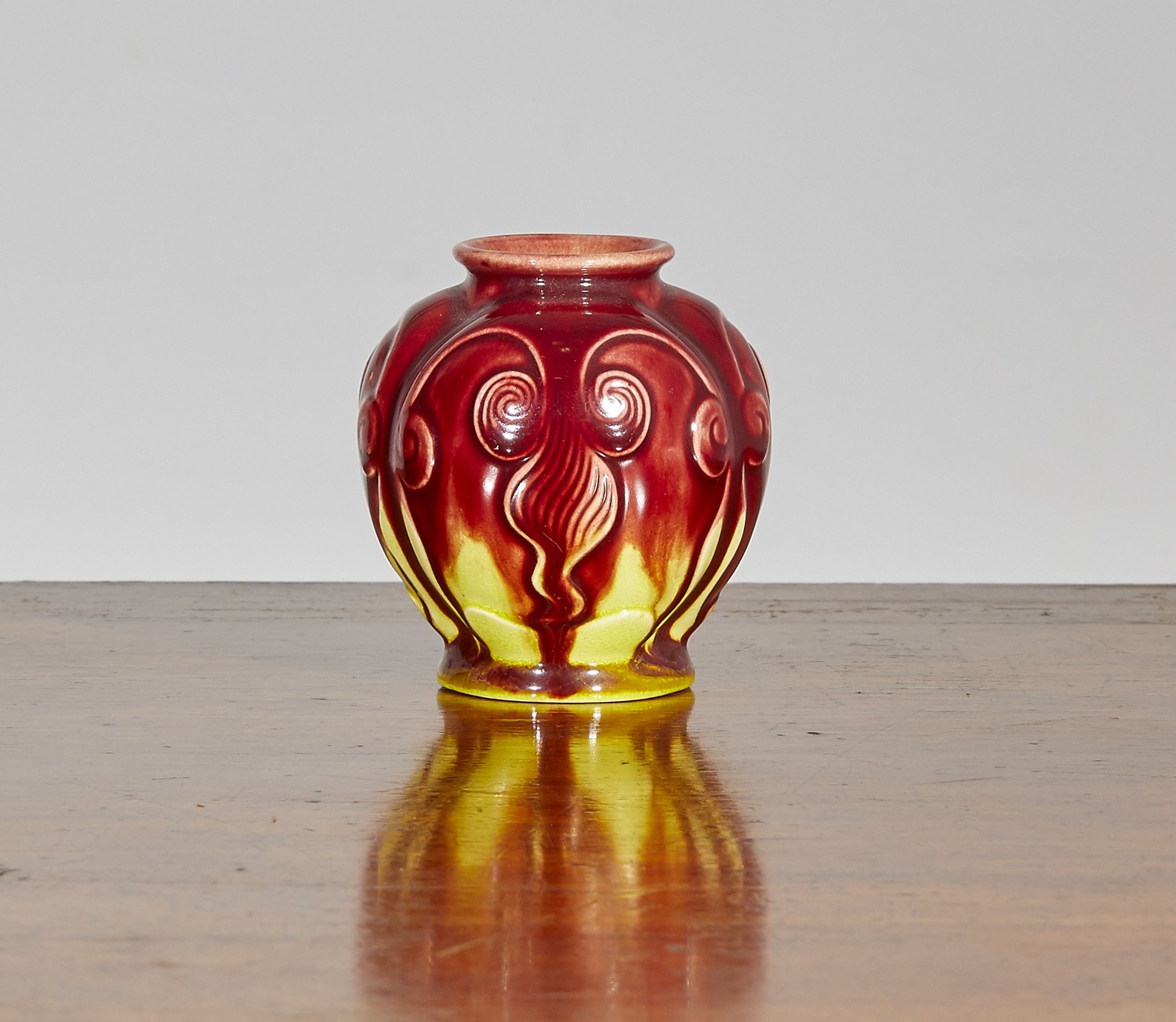 Manufactured by the Linthorpe Pottery, circa 1890 pattern no. 851, ovoid with a moulded design of fleurs de lys, impressed marks.