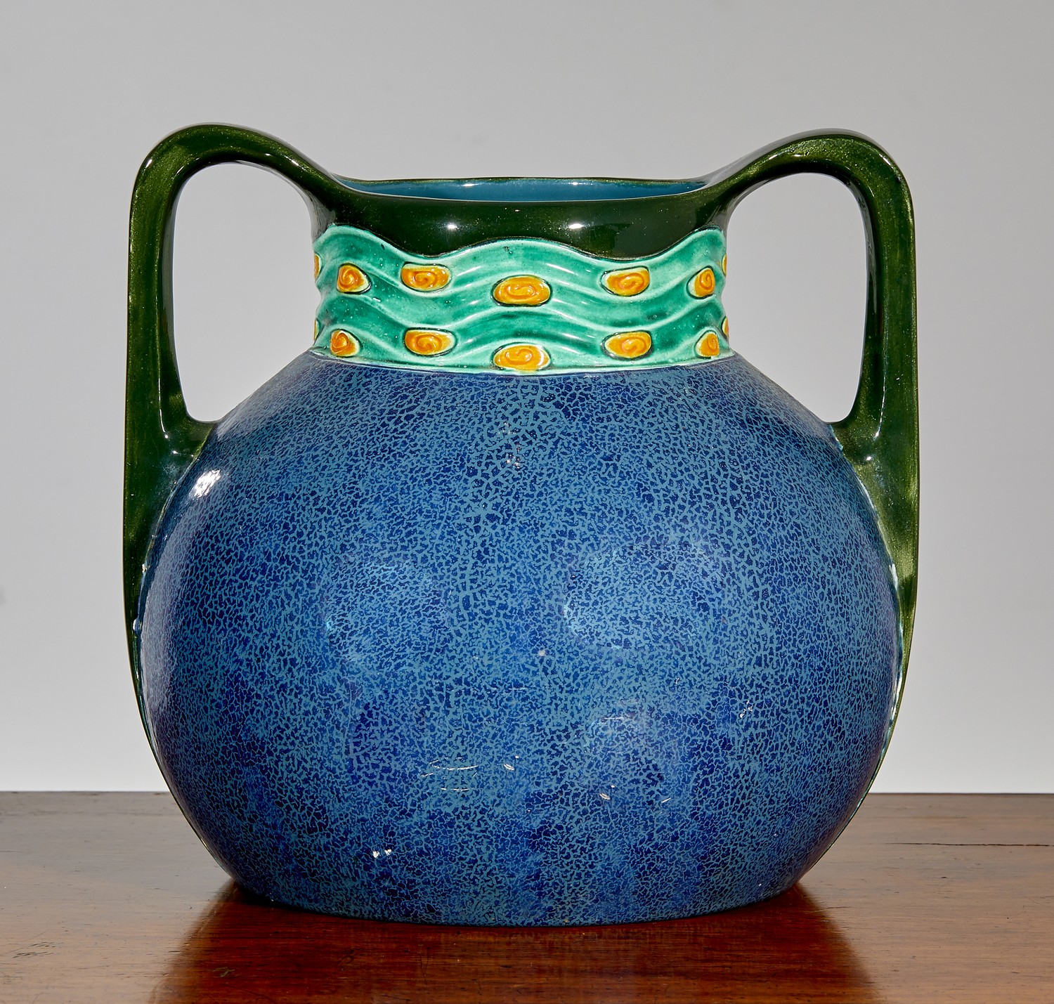 The neck with a waved pattern above the spherical body, impressed and moulded marks.