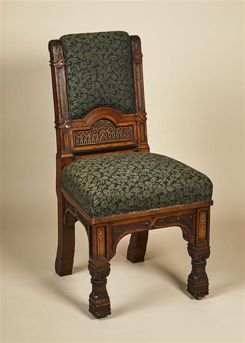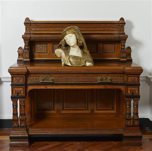 This impressive sideboard and chair correspond to an exhibit at The Paris Universal Exhibition of 1878 by William Walker & Sons, Cabinet manufacturers of 119 Bunhill Row, London; "Sideboard… and two chairs, in the Anglo-Moorish style, made of English Brown Oak, relieved with Pear and Ebony designed by R. Davey." The sideboard is lined to the back in mahogany which would indicate a level of quality expected in an exhibition piece.