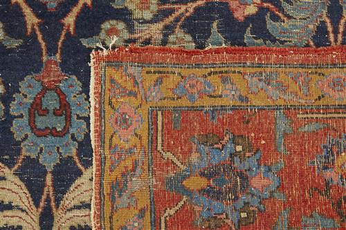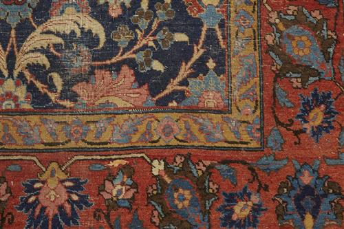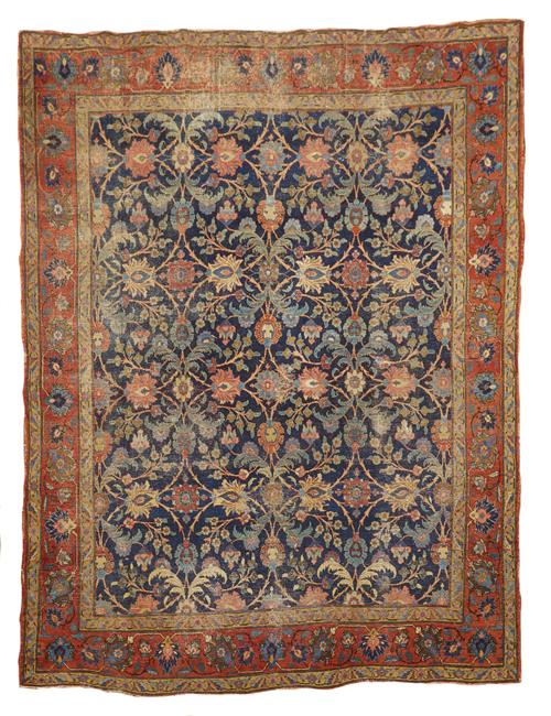 A large persian woollen carpet, with border of flowers in pale pinks.