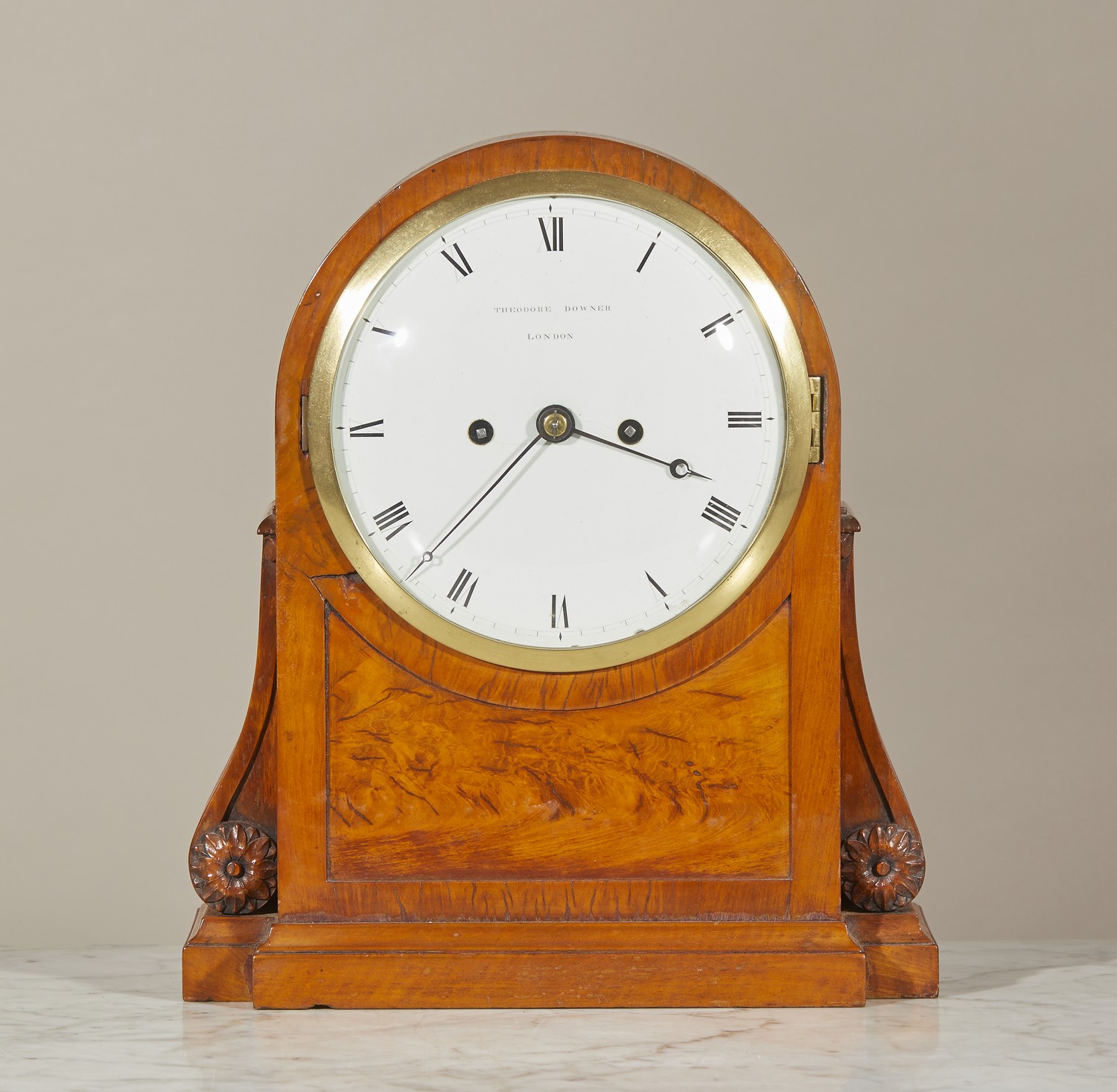 The dial signed Theodore Downer, London, with Roman numerals, the twin fusée movement striking on a bell, the arched case flanked by architectural scrolls on a moulded base.