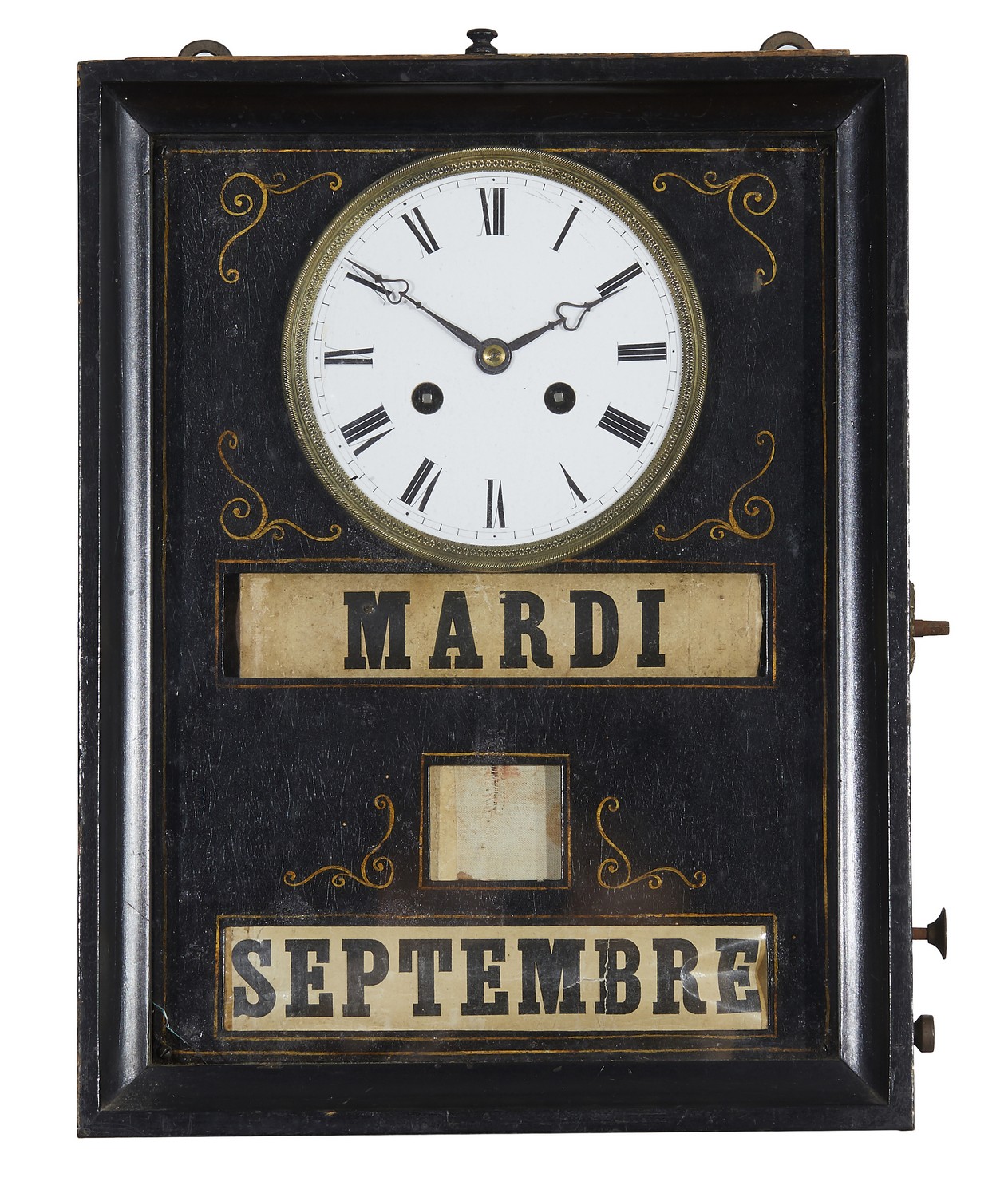 Chip to left lower corner of glass cover, age expected wear to ebonised finish on case, discolouration of day and month scrolls, enamelled dial in excellent condition, has not been tested for working order.