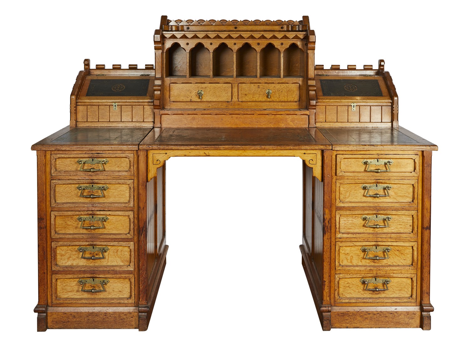 A LARGE VICTORIAN GOTHIC OAK PEDESTAL DESK, BY HOWARD & SONS
