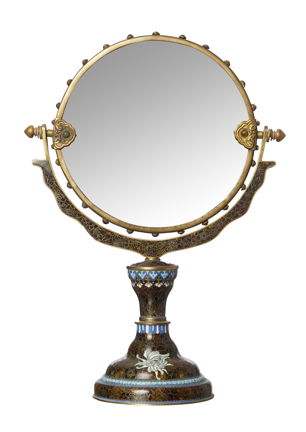 The circular plate in a stand decorated with chrysanthemums and peonies.