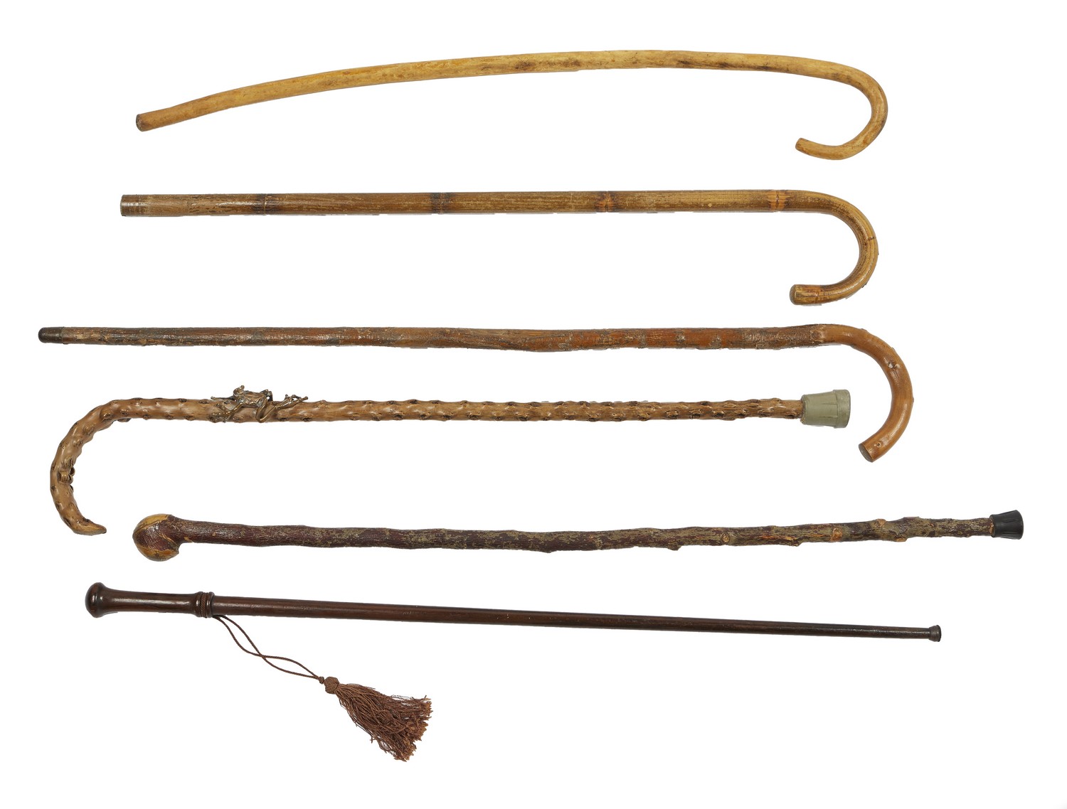 Comprising a knobbly example with a bronze frog mount, three plain crooked sticks in natural woods, a bamboo example, a turned rosewood cane, a brass mounted shoehorn, a Coutts umbrella and another umbrella (9).