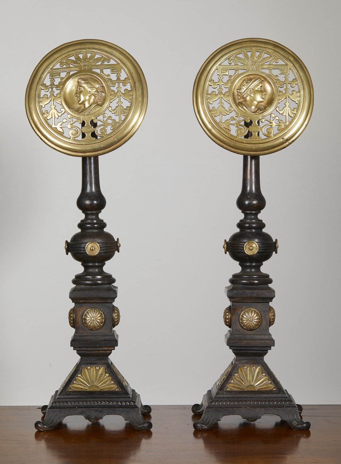 Each with a pierced boss of a woman's profile in relief on a baluster, sphere, cube and pyramidal support, with applied brass foliate ornament, on leaf scroll feet (2).