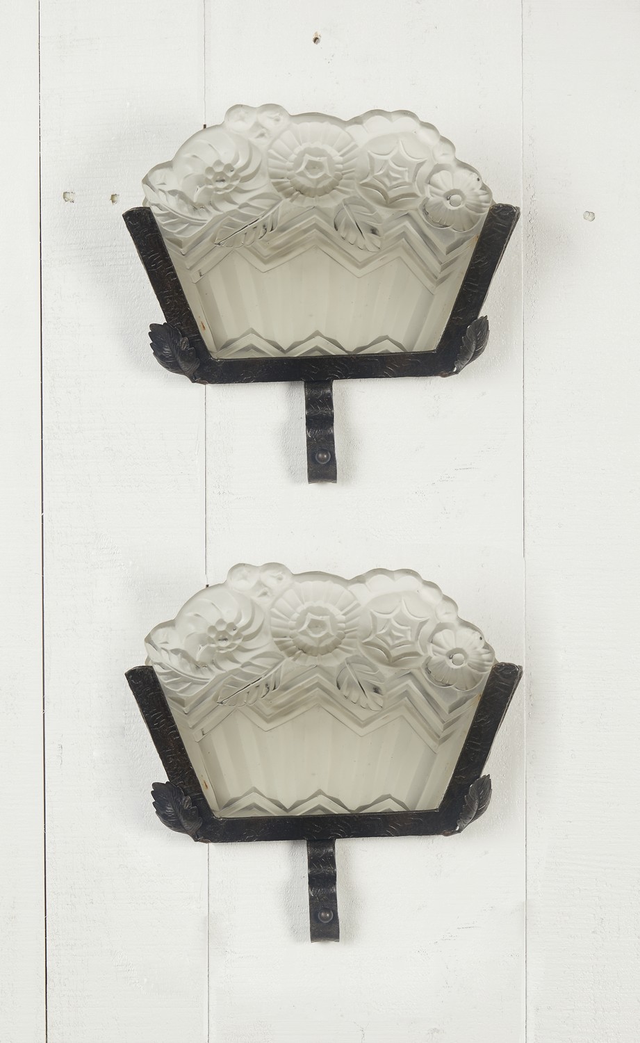 Each in the form of a stylised basket of flowers in textured iron mount with wrought leaves.