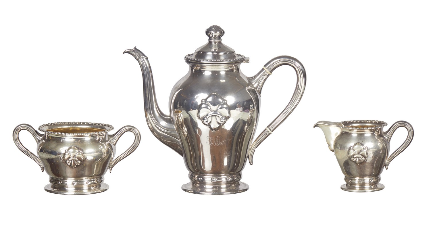 Assay mark of Christian F Heise, 1906-1932, each piece with a beaded rim, and stylised fleur de lys on a moulded foot, engraved with a monogram, the covered coffee pot with bud finial.