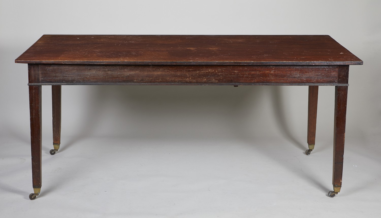 The plain rectangular top on a frieze with reeded edge, on square tapering legs with brass cap castors.