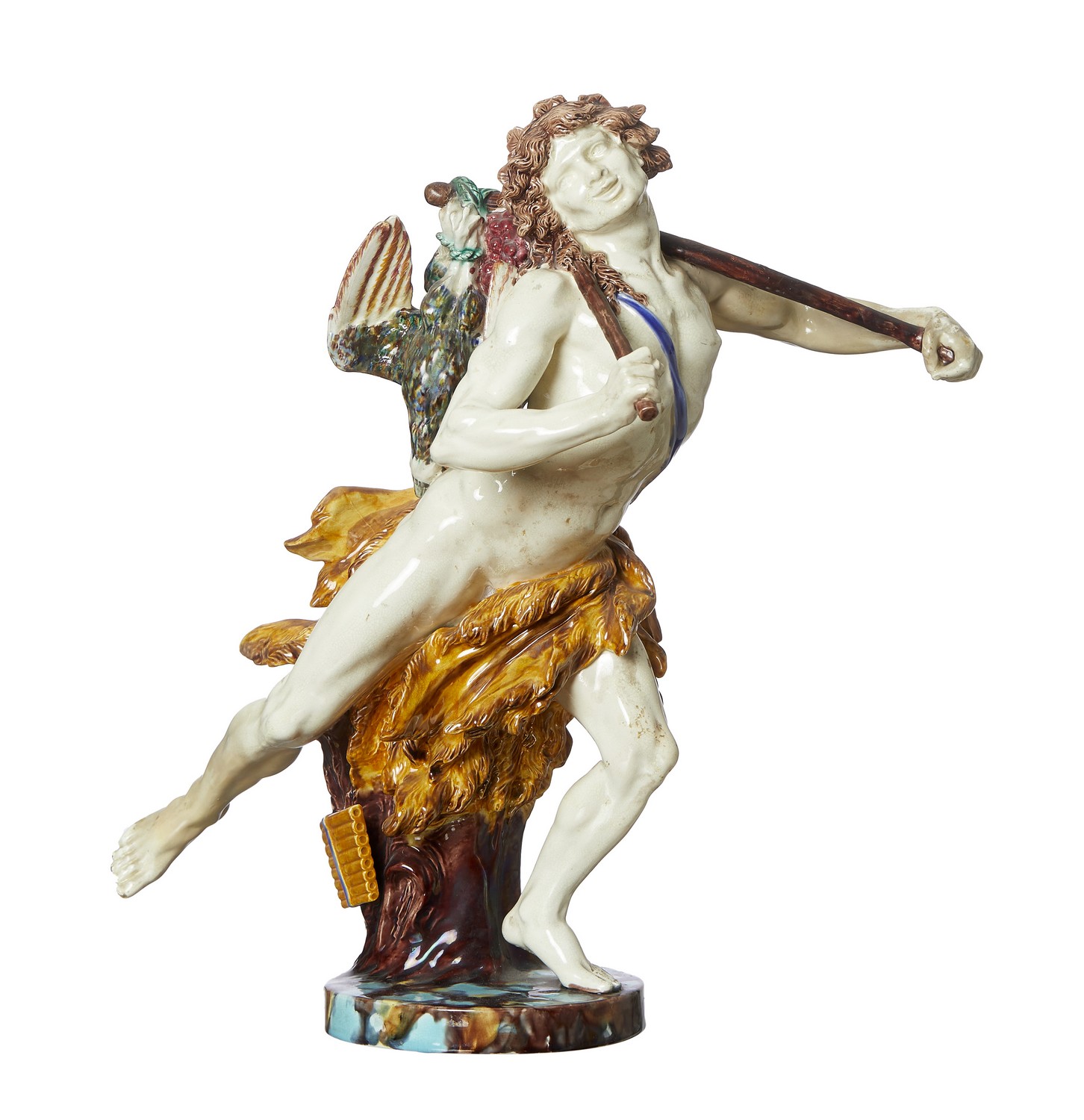 The running god in a goatskin with crossed thyrsoi over his shoulders with game birds, impressed mark, restorations.
