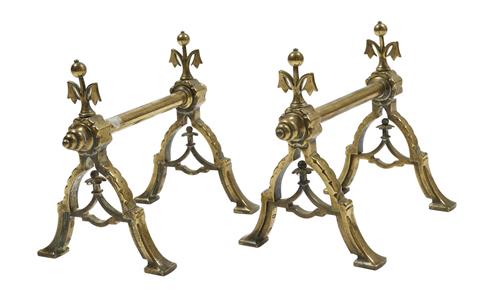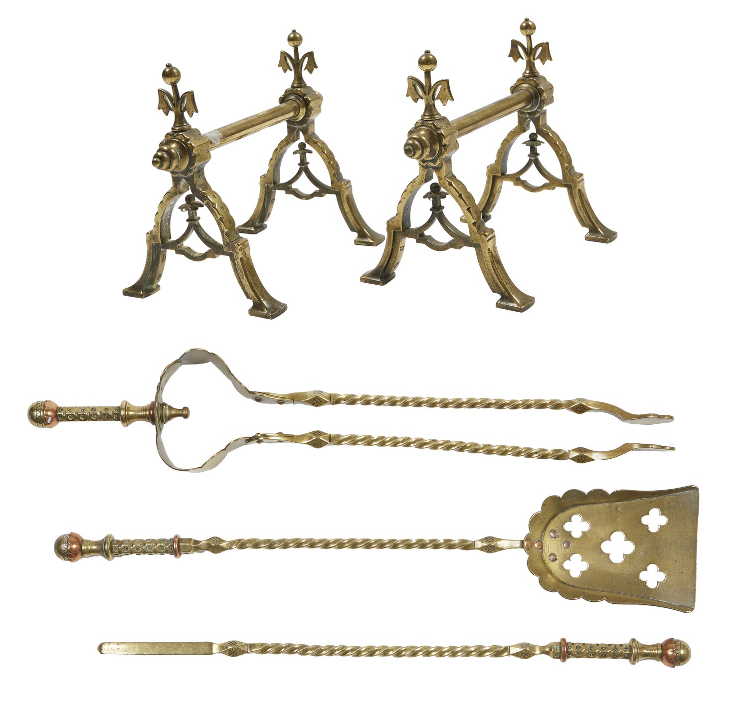 Comprising poker, tongs and shovel all with spiral twist shaft and copper flowerhead finials, the fire dogs with triangular end supports and stylised fleur de lys finials (5).