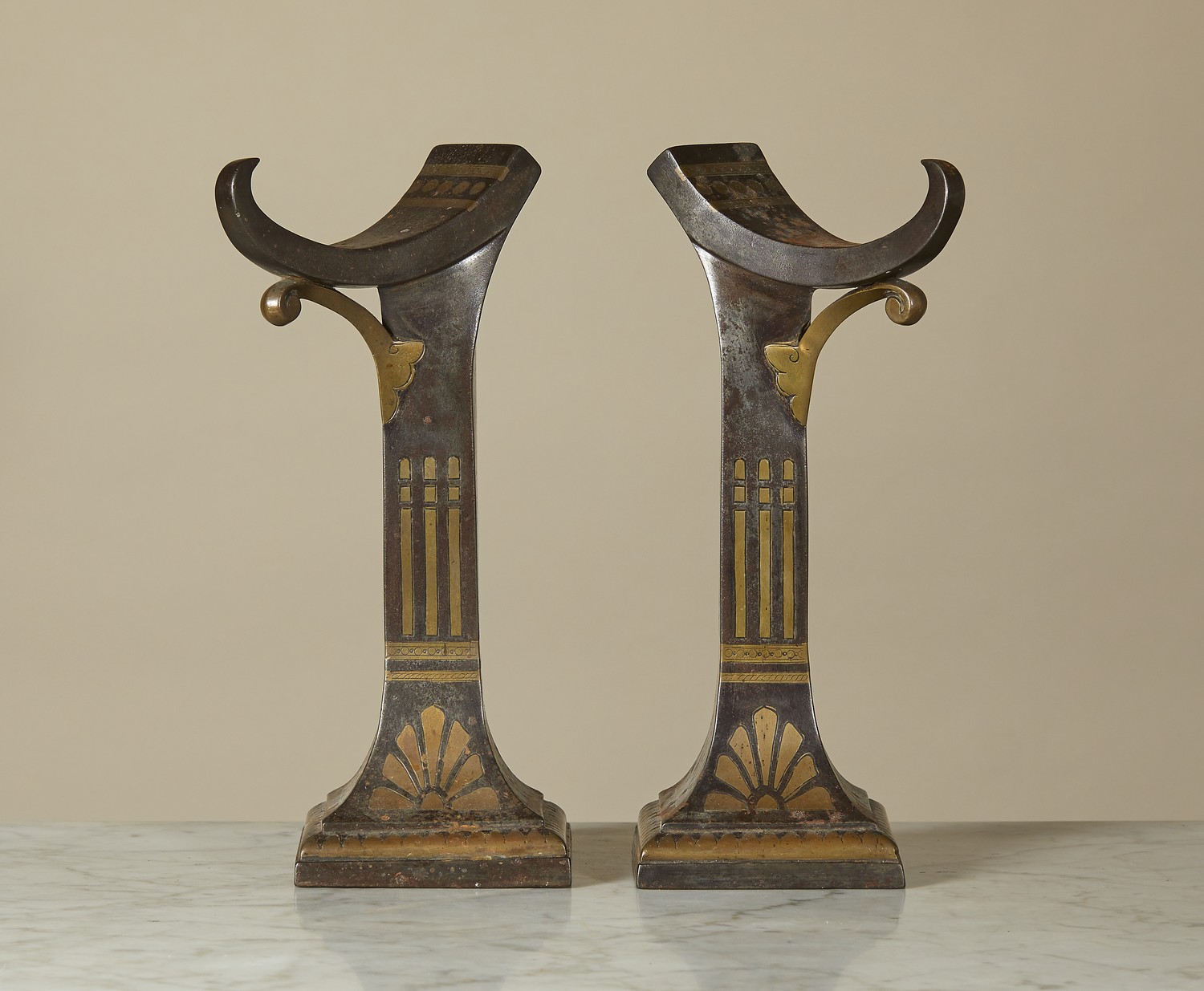 Each on a square base rising to a tapering shaft supporting a crescent tool rest.