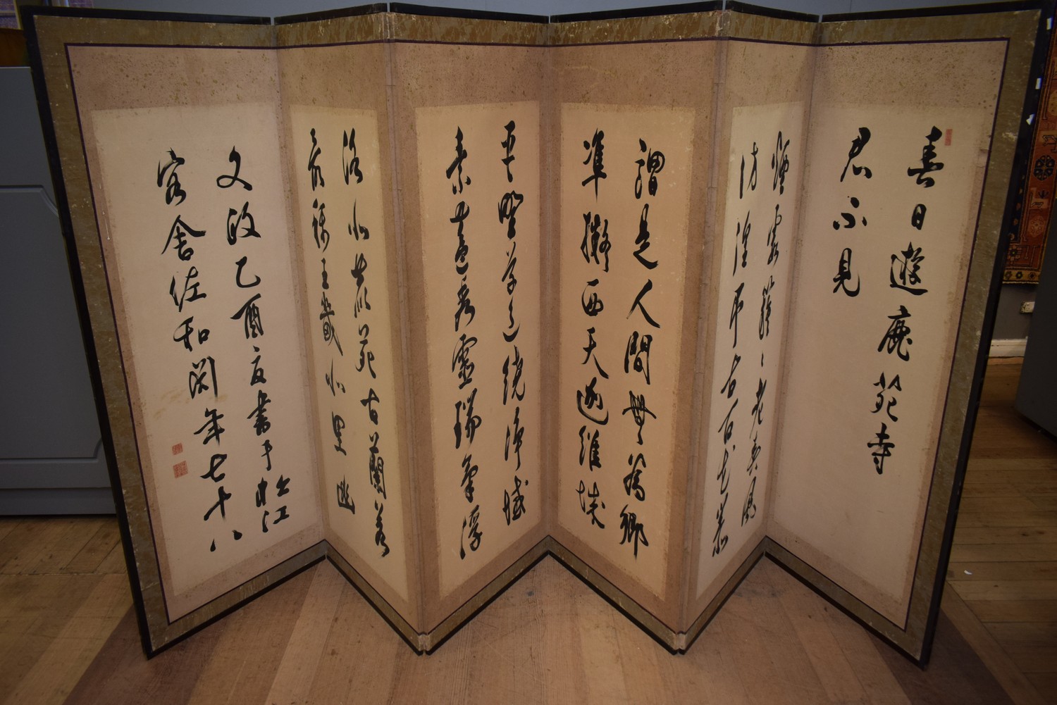 A JAPANESE SIX PANEL FOLDING SCREEN WITH TEXT (A/F) (173H X 64W CM EACH PANEL)