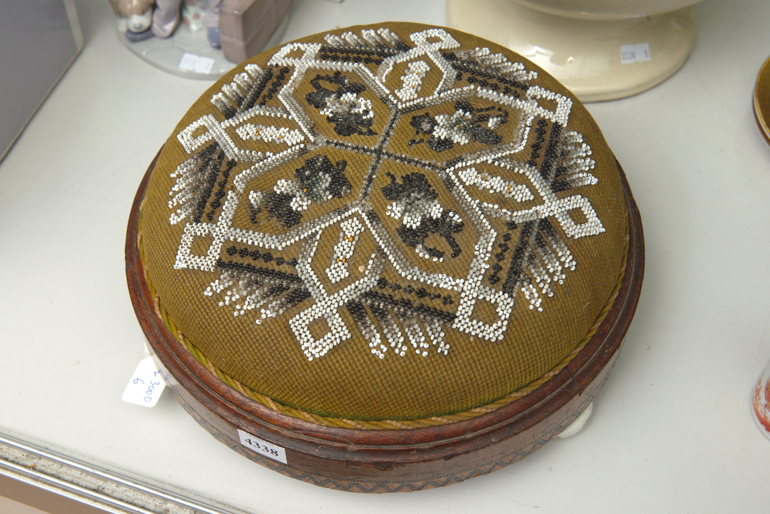 A VICTORIAN UPHOLSTERED AND BEADED TIMBER FOOT STOOL, WITH PORCELAIN FEET, CIRCA 1880, DIAMETER 26CM, A/F