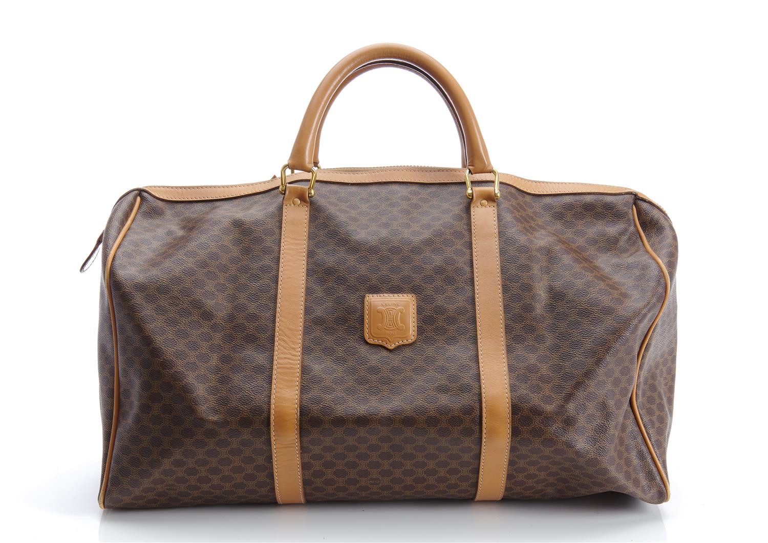 Styled in brown Marcadam coated canvas with brown leather trim and gold metal hardware, 40 x 21 x 21cm.