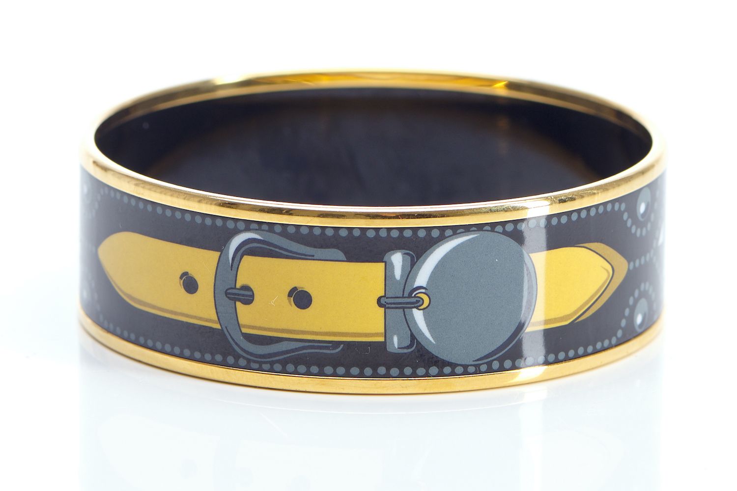 Styled with a yellow belt and buckle motif on a patterned black background, diameter 6.5cm.