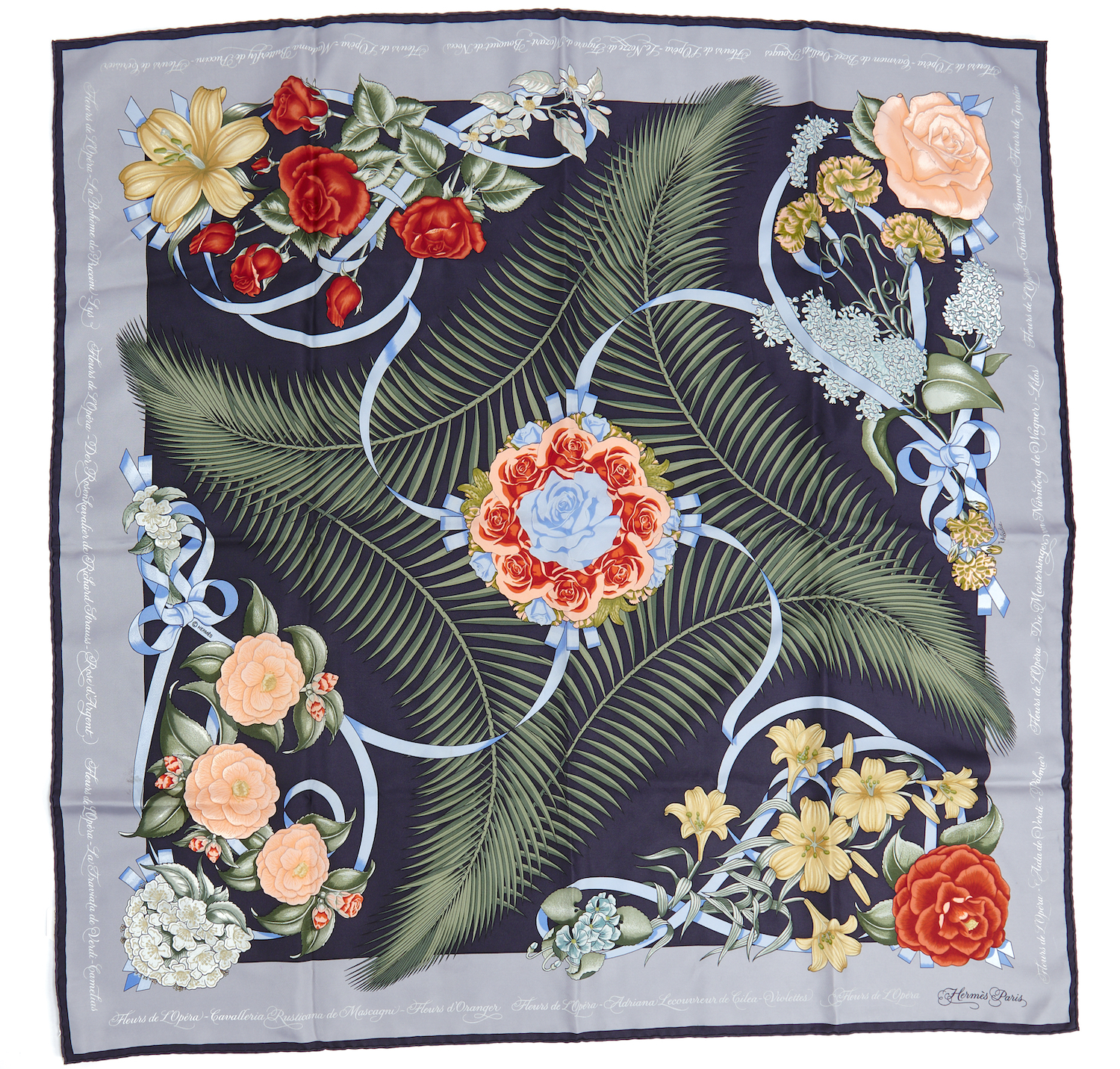 The 'Fleurs de l'Opera' design by Julia Abadie with floral design on charcoal and grey background, 90cm square.