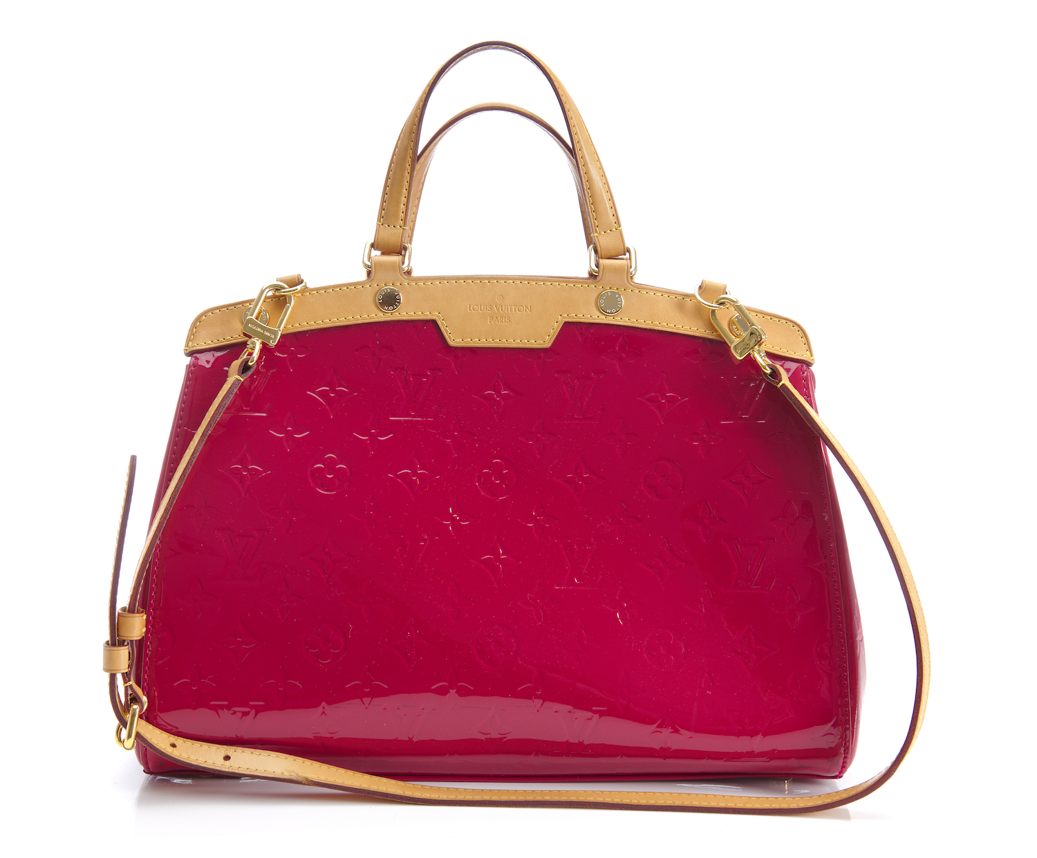 Styled in pink monogram Vernis calf leather with golden brass metal hardware, 33 x 23 x 13cm.
