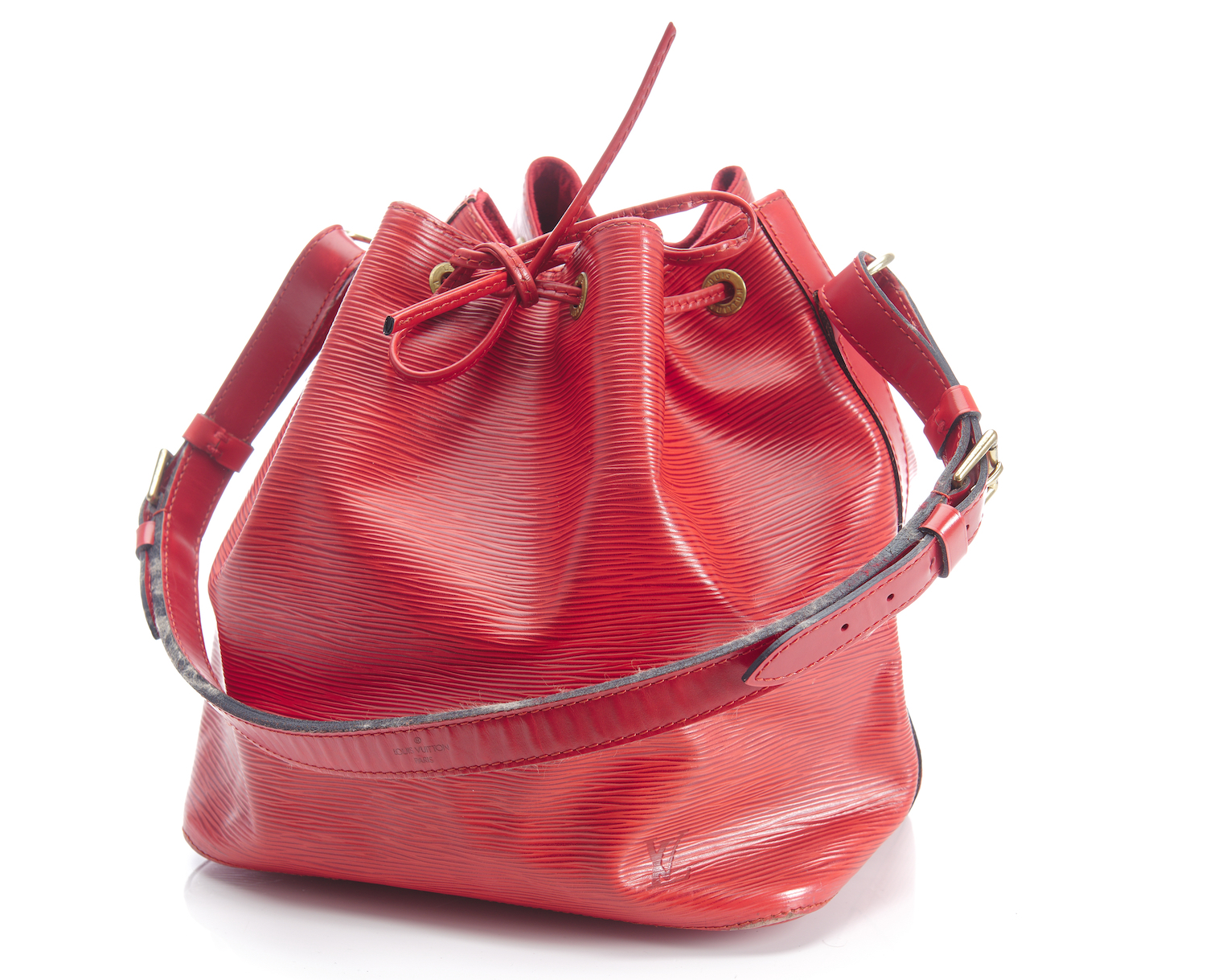 Styled in red Epi calf leather with golden brass metal hardware, 24 x 26 x 18cm.
