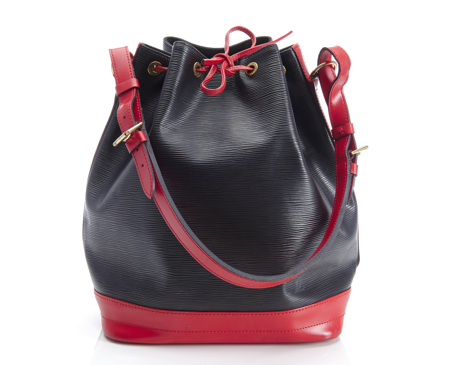 Styled in black Epi calf leather with red leather trim and golden brass metal hardware, 27 x 34 x 16cm.