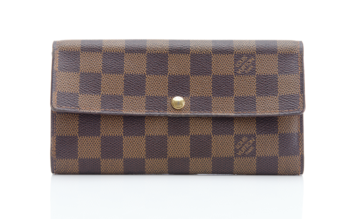 Styled in Damier Ebene coated canvas with golden brass metal hardware, 19 x 10 x 1.5cm.