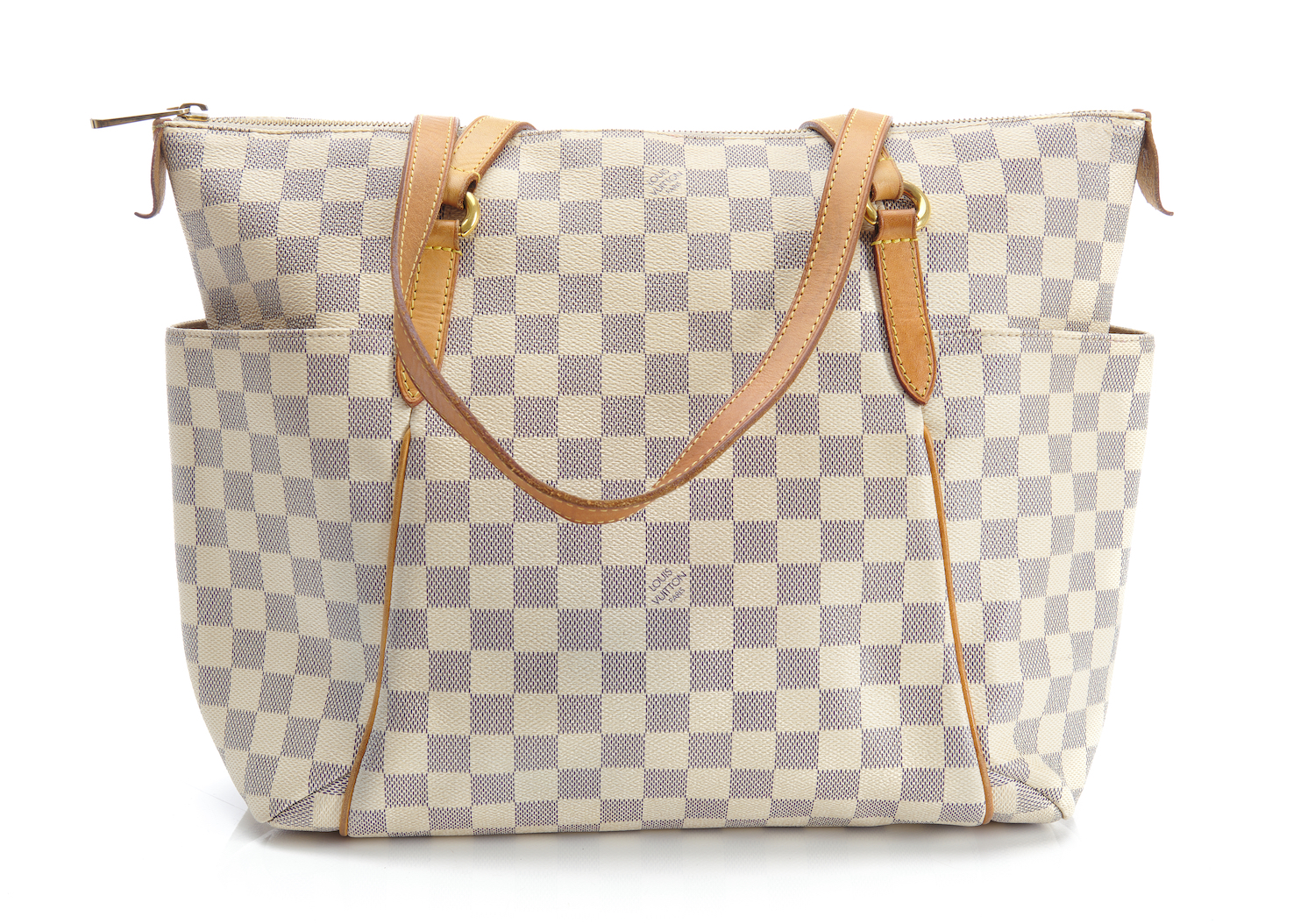 Styled in Damier Azur coated canvas with golden brass metal hardware, 34 x 29 x 14cm.