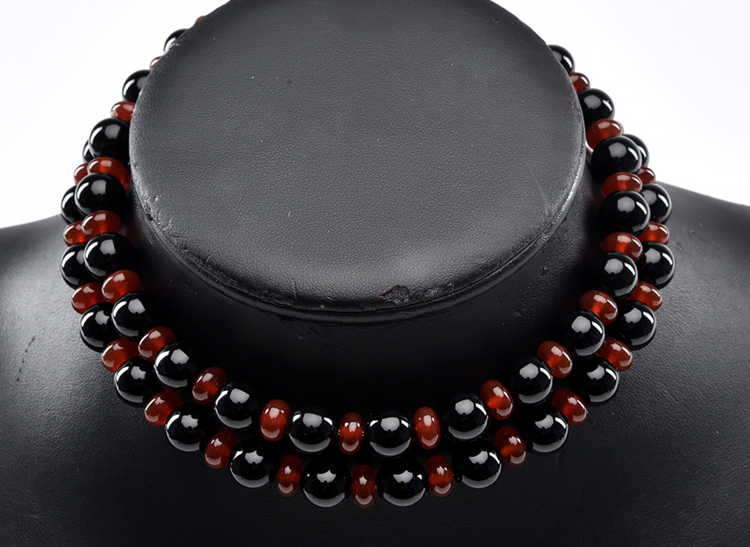 A STRAND OF BLACK JADE AND CARNELIAN BEADS, CLASP SIGNED SEBASTIAN CILENTO, TOTAL LENGTH 680MM