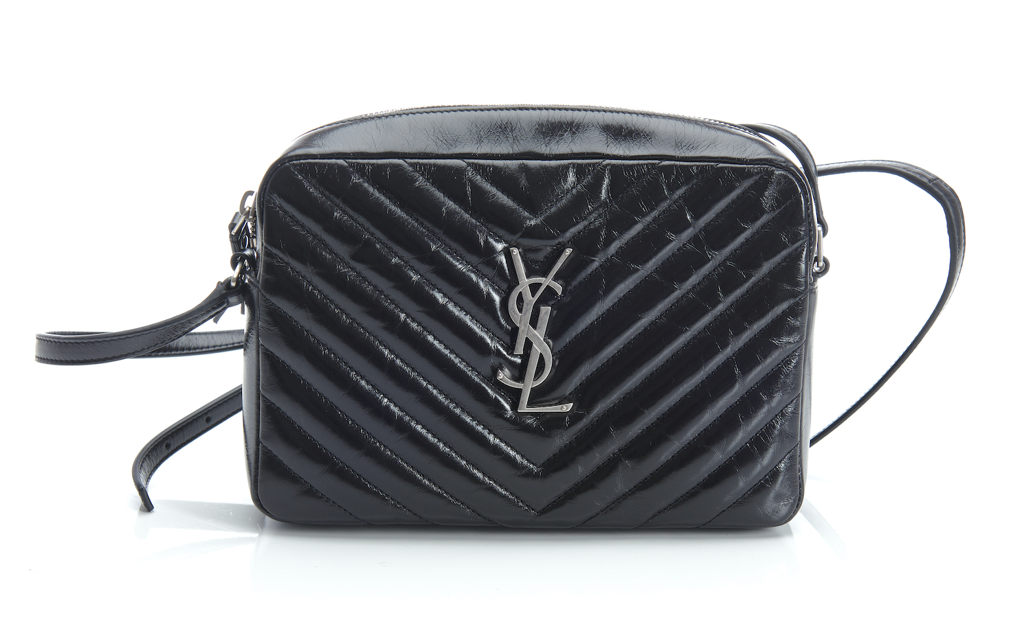 Styled in chevron quilted black leather with silver metal hardware and shoulder strap, 22 x 15 x 6cm.