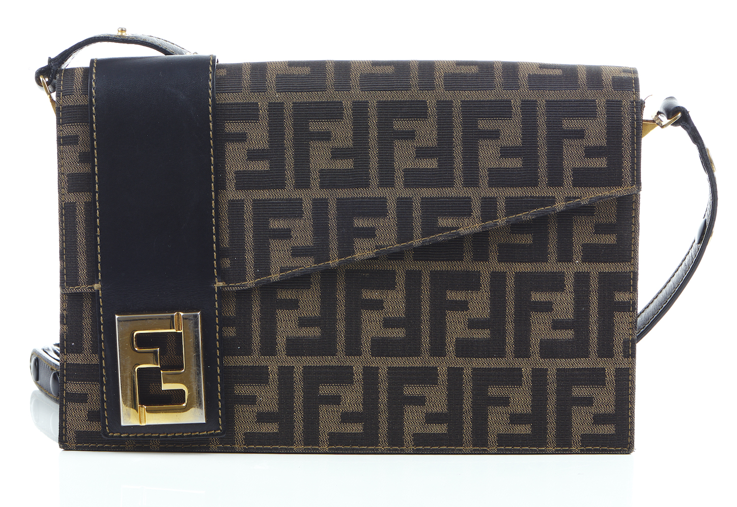 Styled in Zucca monogram canvas with brown leather trim and gold metal hardware, 26 x 17 x 3cm.