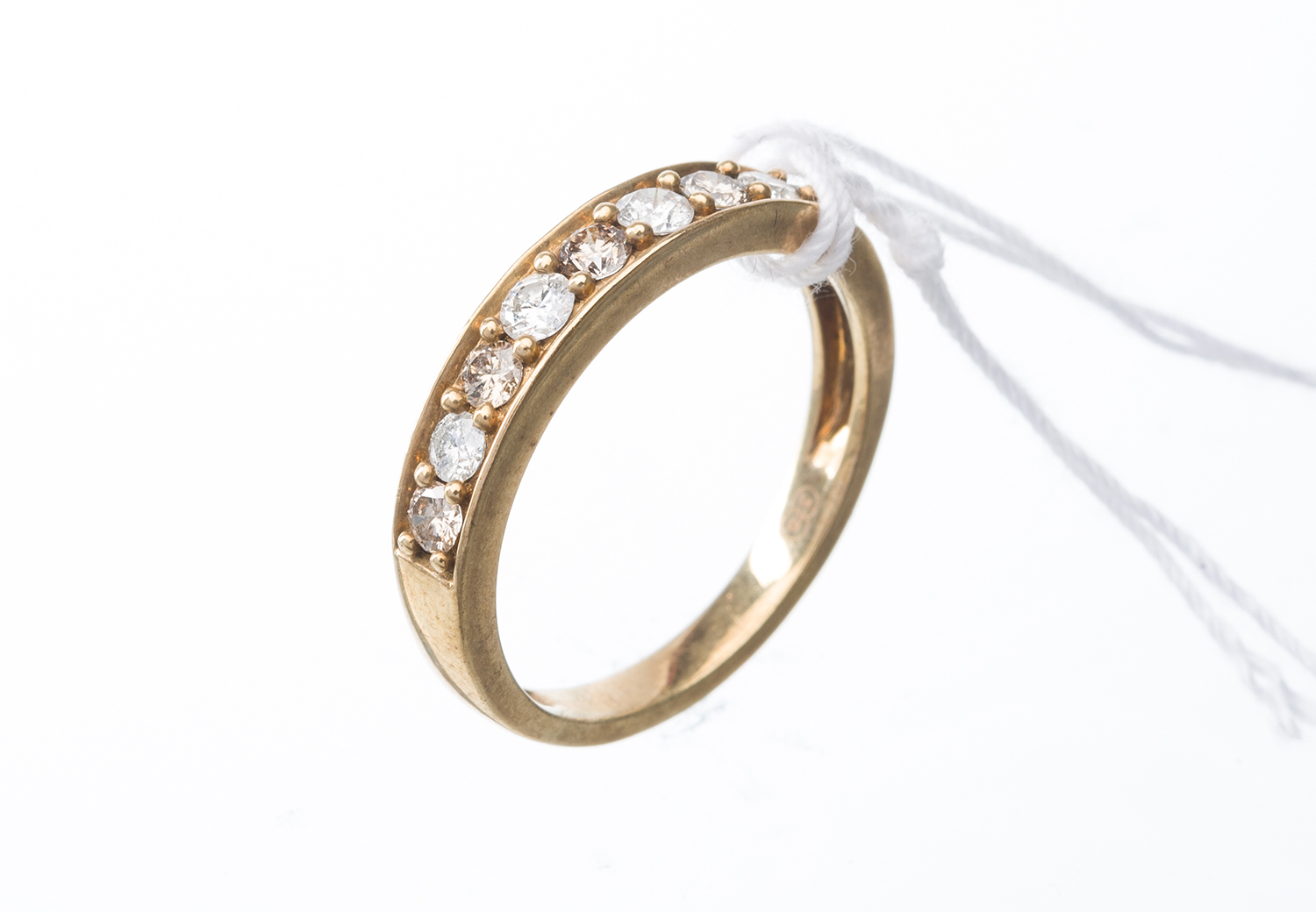 A WHITE AND CHAMPAGNE DIAMOND HALF HOOP RING TOTALLING 0.50CTS, IN 9CT GOLD, RING SIZE M-N, 2.6GMS