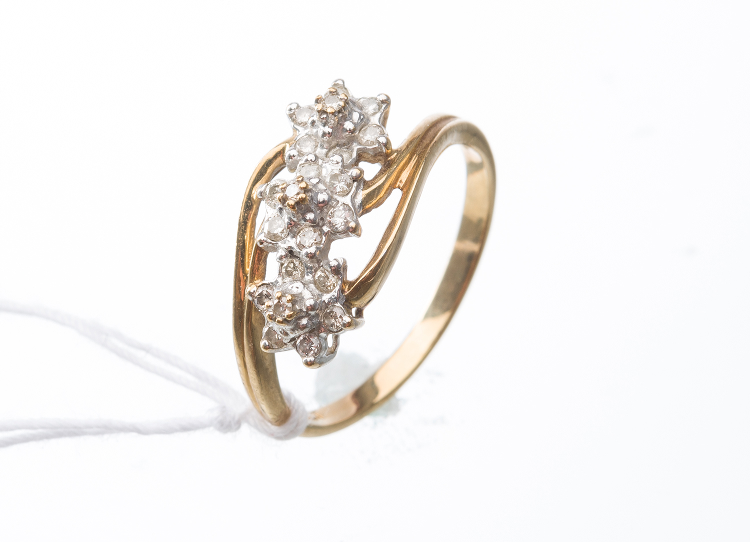 A TRIPLE DIAMOND CLUSTER RING IN 9CT GOLD, RING SIZE O, 2.2GMS