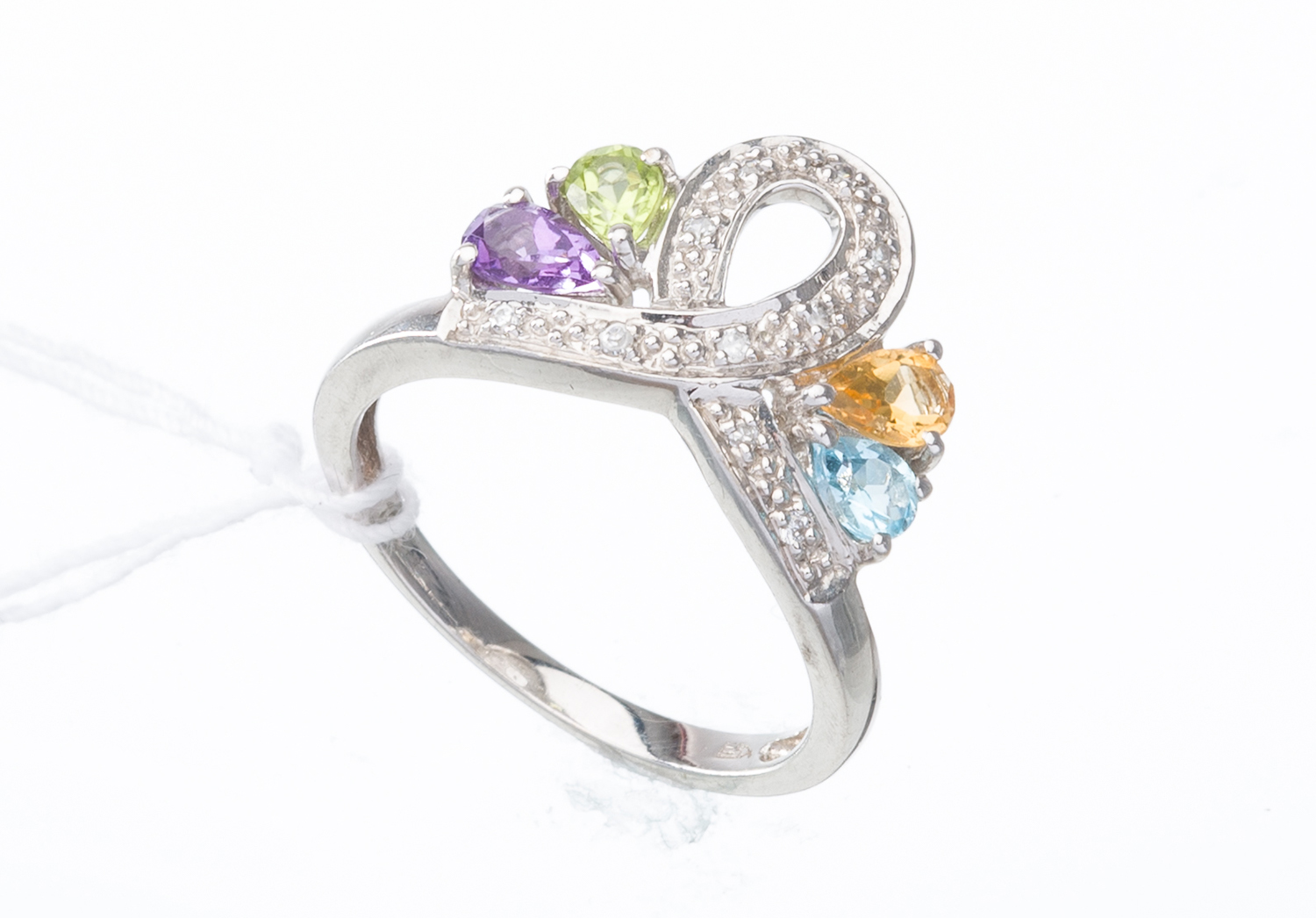 A TOPAZ, AMETHYST, PERIDOT, CITRINE AND DIAMOND DRESS RING IN 10CT WHITE GOLD, RING SIZE N, 2.9GMS