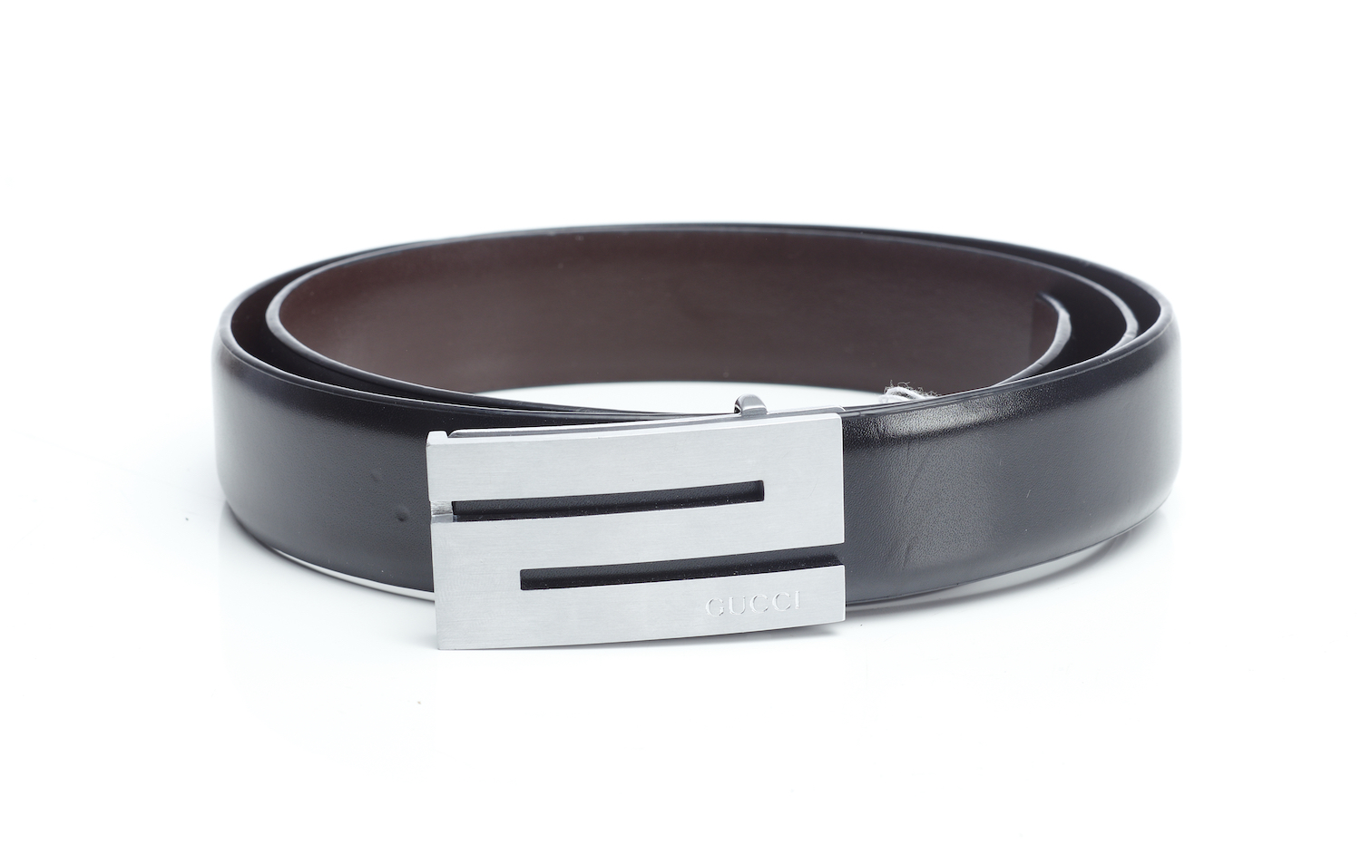 The double sided belt in black and brown leather, to a signed silver metal buckle, labelled size 50