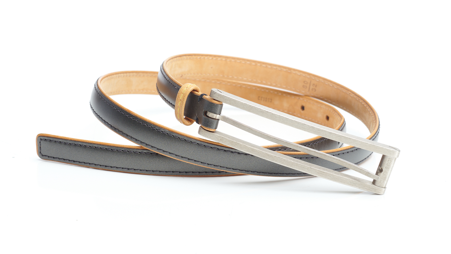 Styled in anthracite coloured leather with tan leather reverse, to a brushed silver metal buckle, labelled size 80/23.
