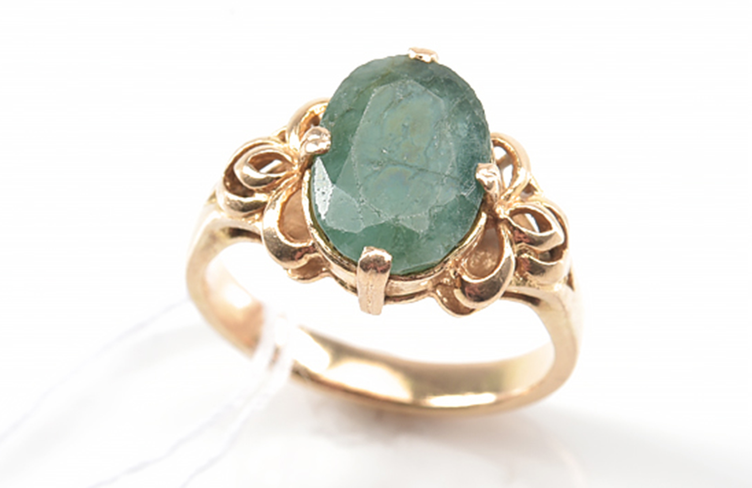 AN EMERALD DRESS RING IN 9CT GOLD, SIZE J, 3.6GMS