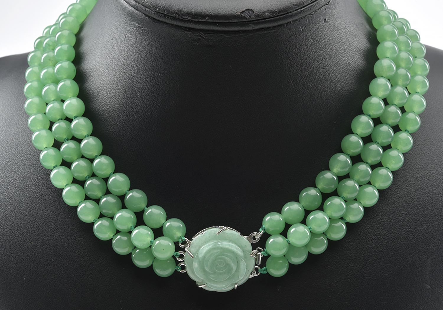 A TRIPLE STRAND JADE SIMULANT BEAD NECKLACE TO A CARVED FLORAL STYLE JADE CLASP, TOTAL LENGTH 450MM (INCLUDING CLASP)